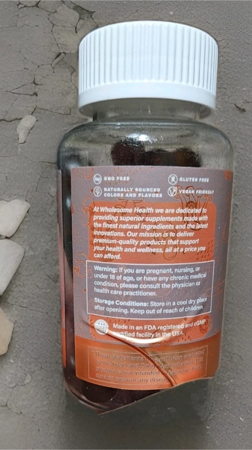 Selling a bottle of Wholesome Health Mushroom Mind Boost dietary supplement. Each bottle contains 60 raspberry flavored gummies. This supplement boosts cognitive function, enhances focus and memory, supports immune health, and reduces stress and promotes relaxation.