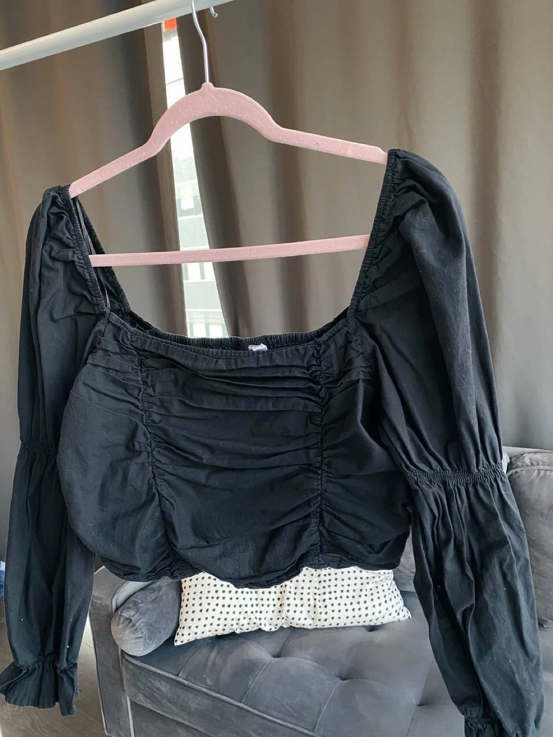 Black long sleeve crop top with elastic waistband and puff sleeves. Square neckline.