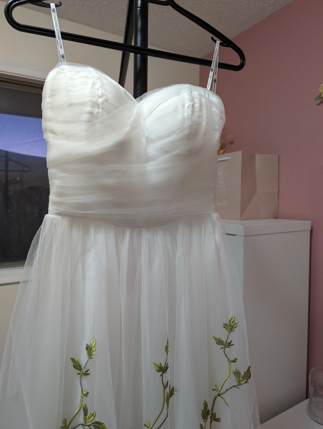 Selling a beautiful embroidered tulle dress. It's in great condition and features delicate floral embroidery. Perfect for a special occasion or a whimsical wedding/bridal shower look! It has straps you can add to the dress.