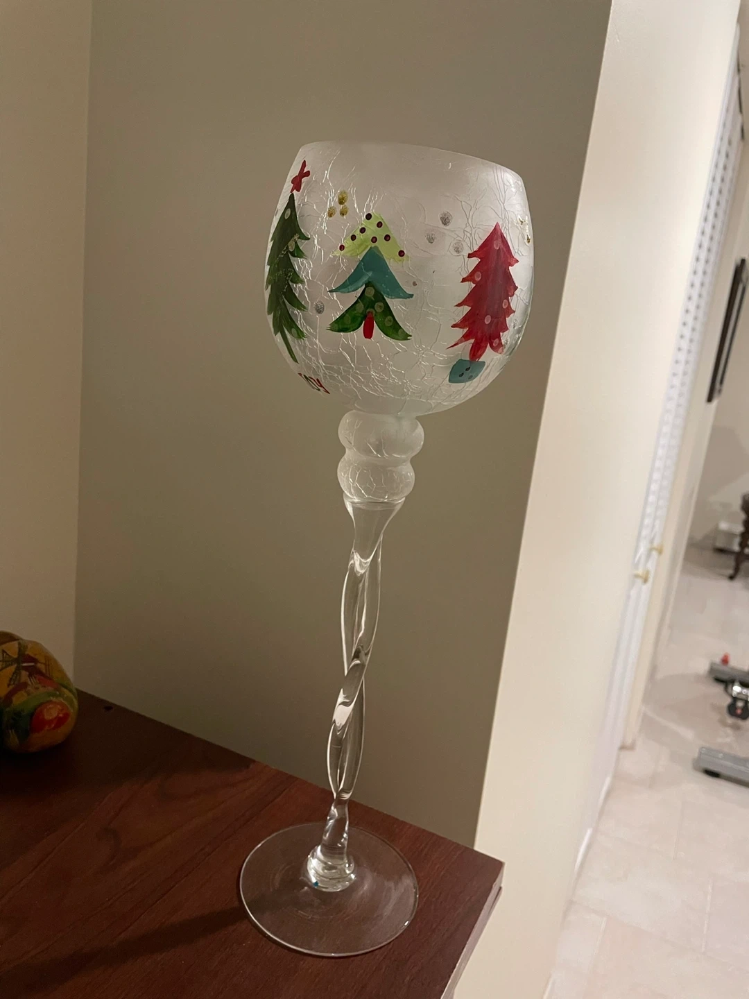 Here's a tall candle holder featuring a festive Christmas tree design! It's perfect for adding a touch of holiday cheer to any room in your home.