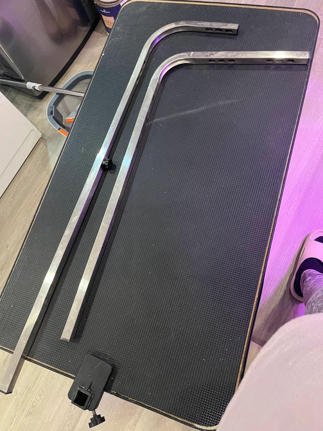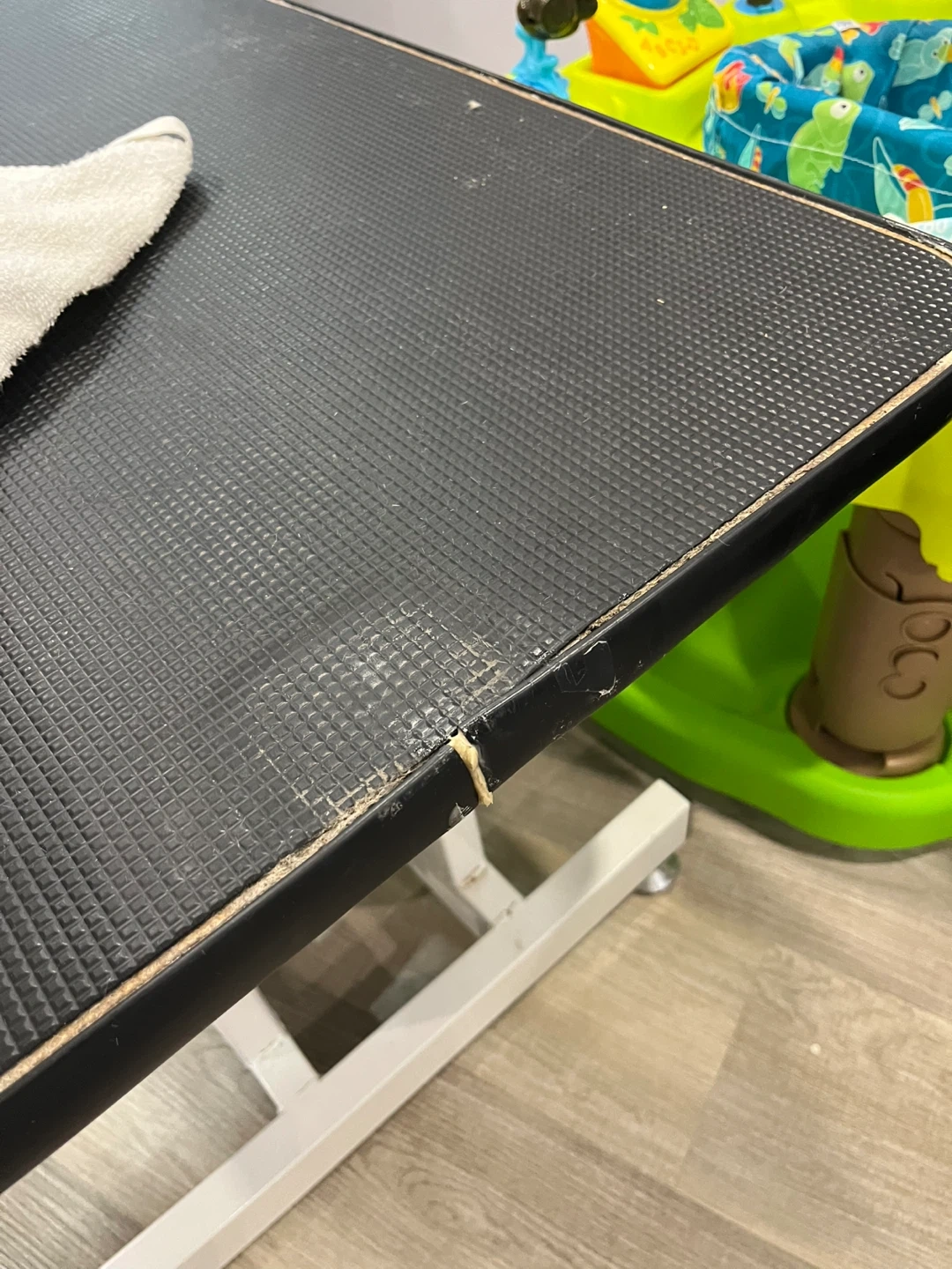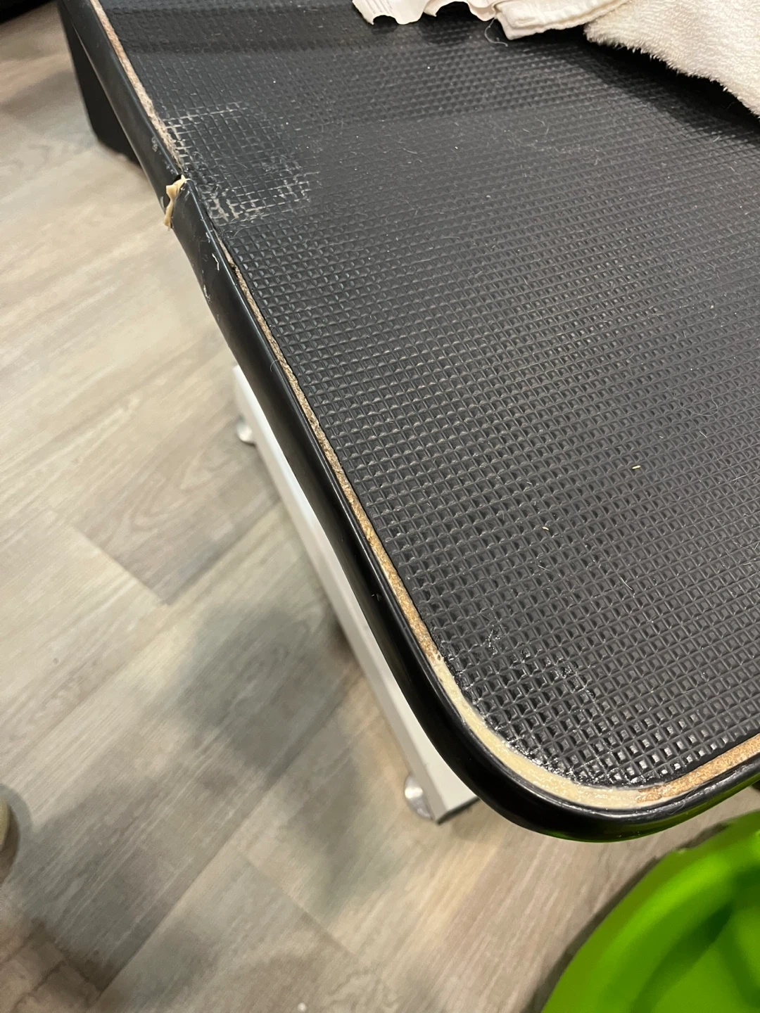 Hydraulic dog grooming table. It features a black textured surface and adjustable grooming arm. There are signs of wear on the table's edges.