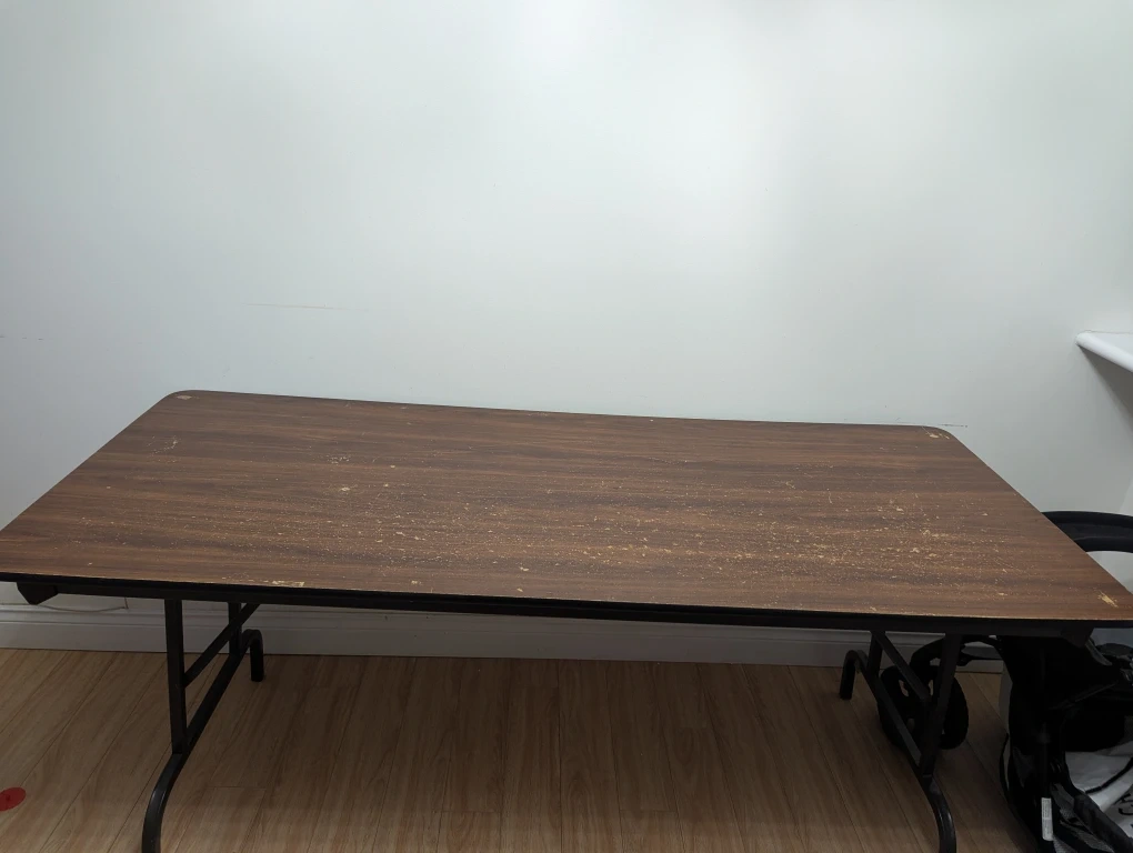 Selling a folding table with a brown top and black metal legs. It's sturdy and perfect for extra space when you need it!