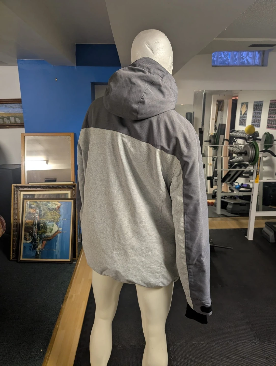 It features a grey colour block design, several zippered pockets, and a hood for extra warmth. The jacket has wrist gaiters, and a powder skirt for keeping wind out and keeping you warmer.