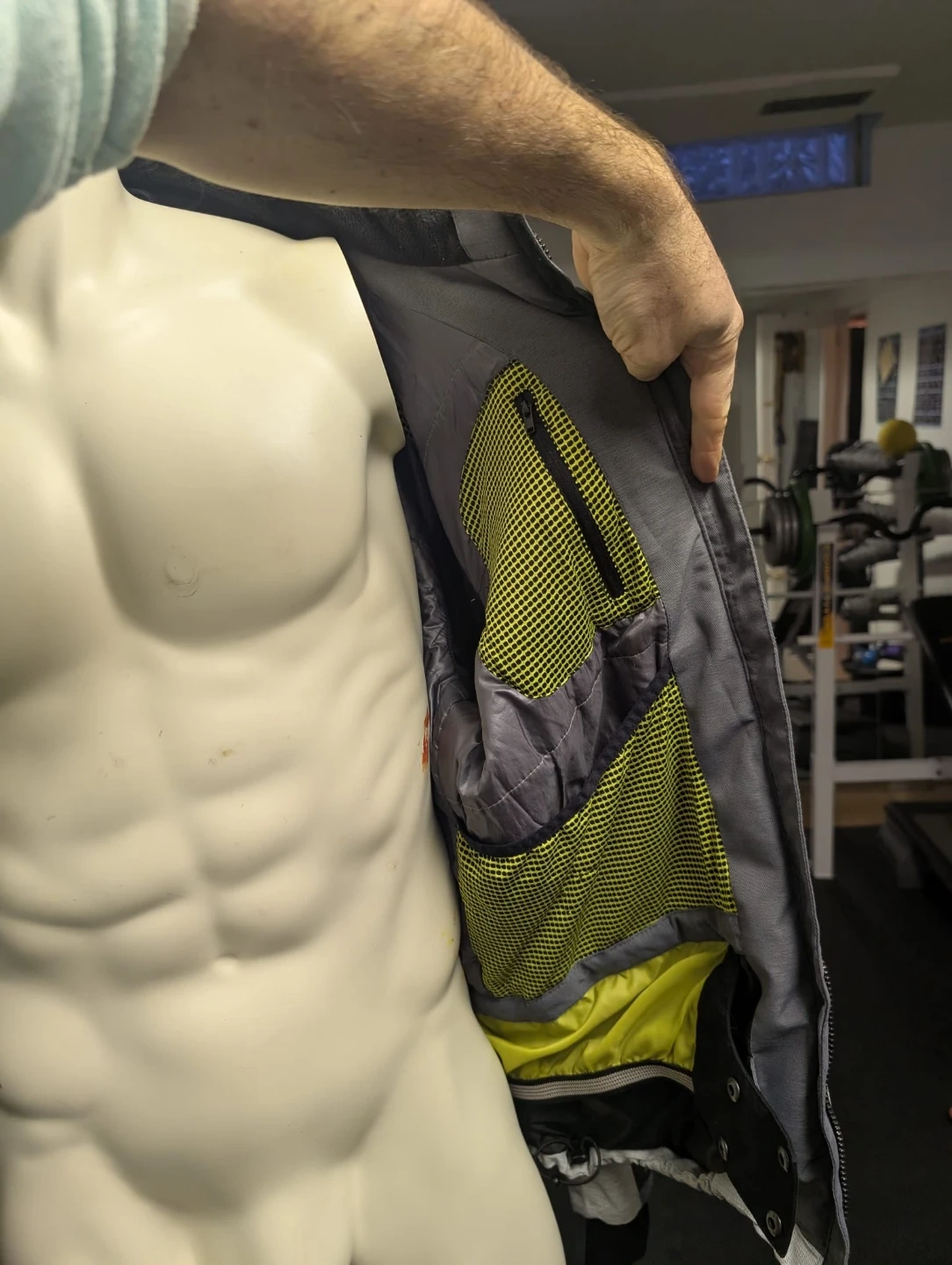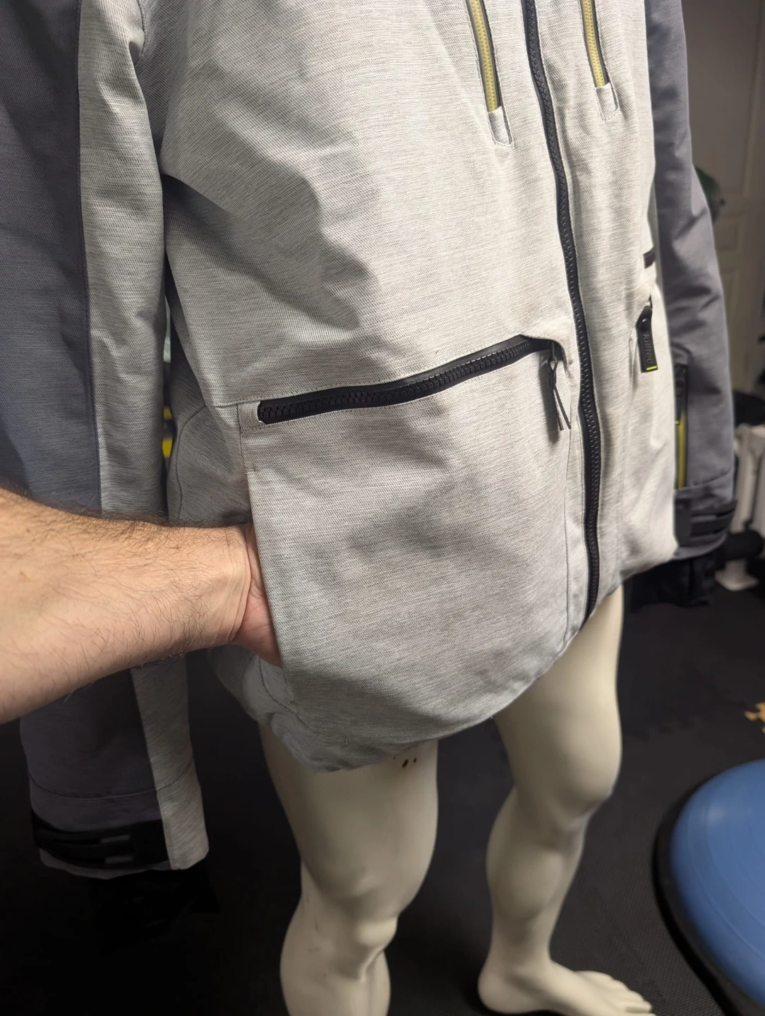 Waterproof zipper pockets on the front chest and the arm. The Arm pocket is great for the membership card where RFID readers are accepted like mount st louis for example.