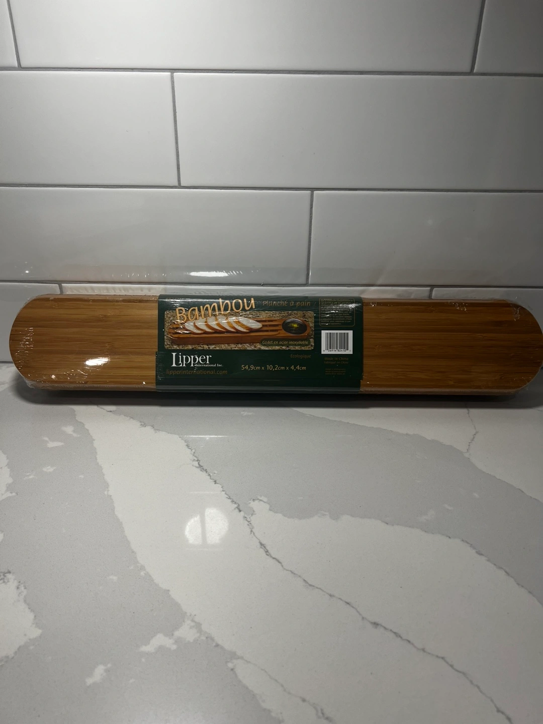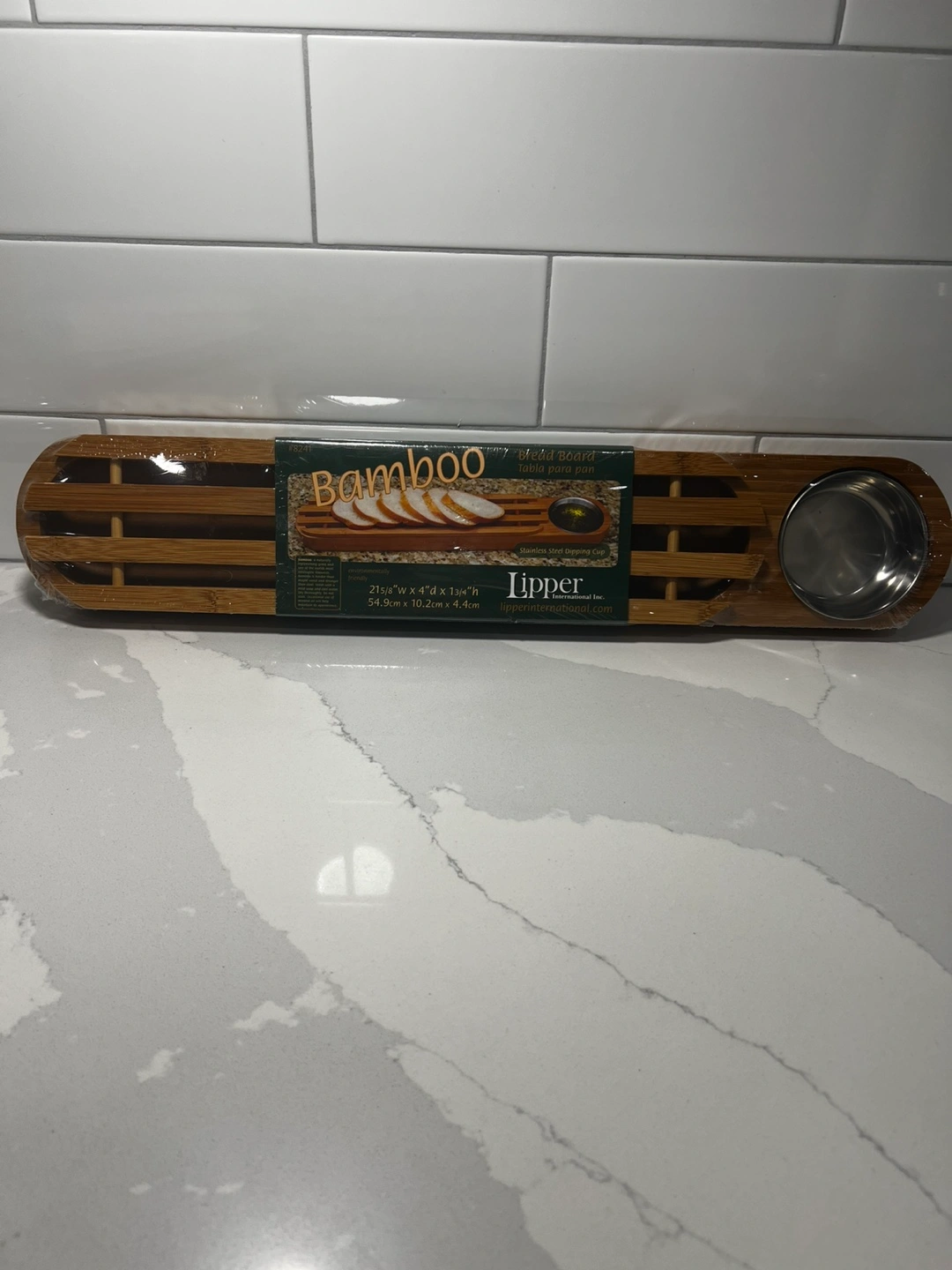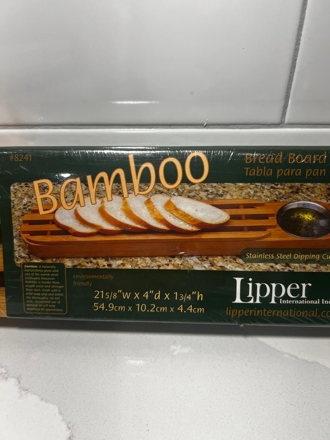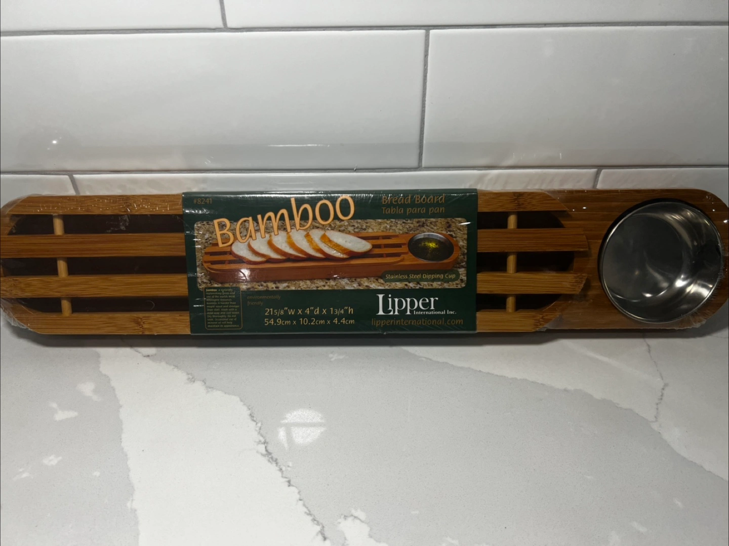 I'm selling a brand new Lipper International bamboo bread board! It features a stainless steel dipping cup. The dimensions are 21 5/8" w x 4" d x 1 3/4" h, or 54.9cm x 10.2cm x 4.4cm. It is still in its original packaging