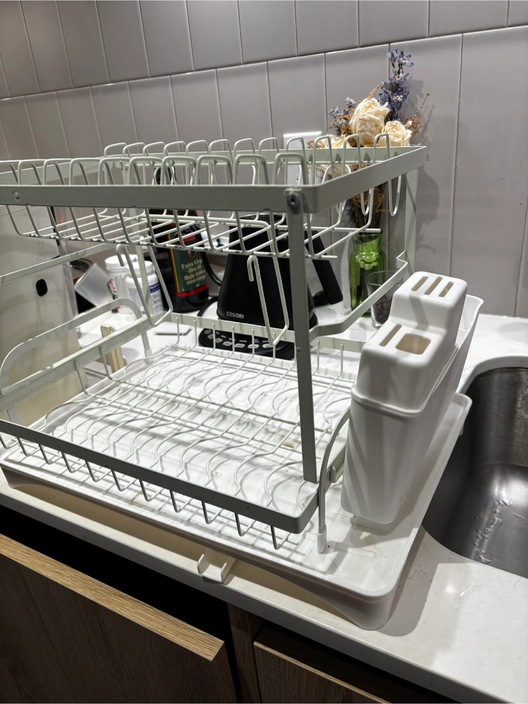 Here's a handy dish drying rack! It's perfect for keeping your dishes organized and dry. It features a two-tier design to maximize space and includes a utensil holder.