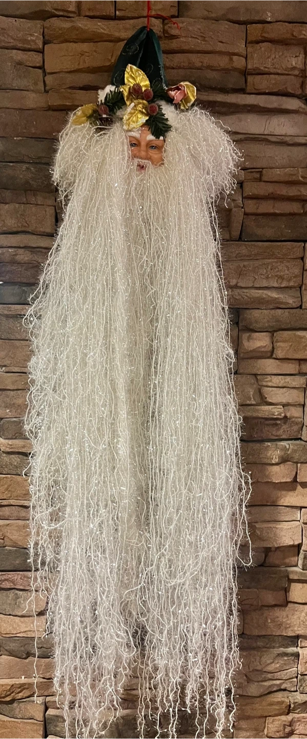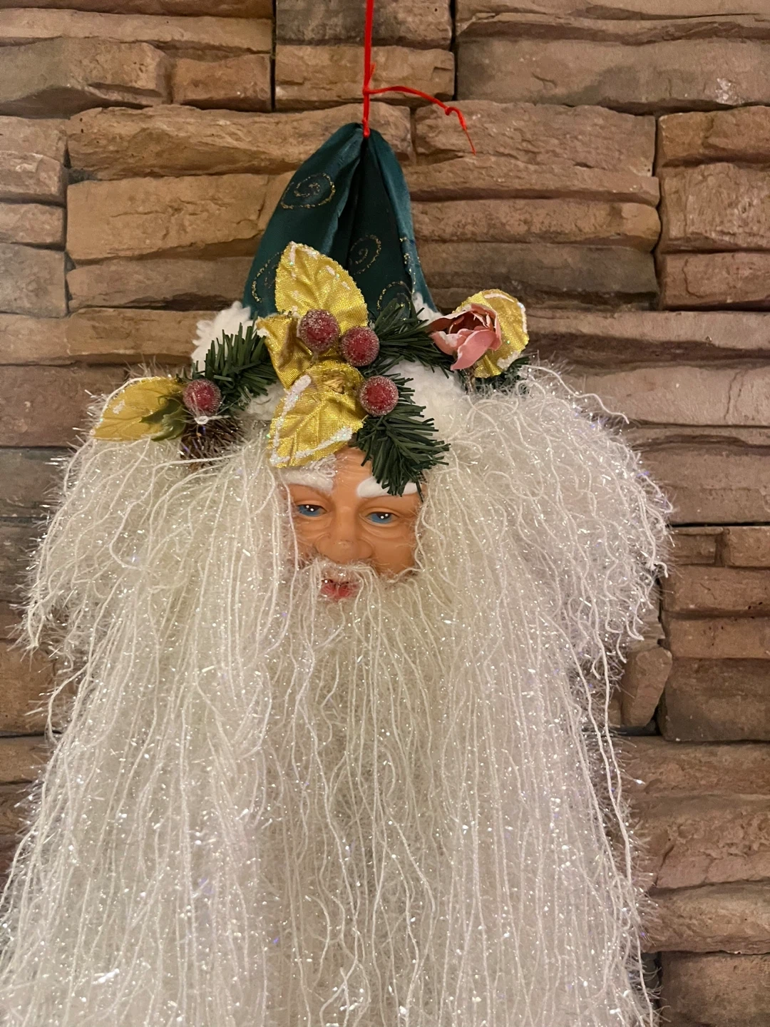This is a charming Christmas Santa wall hanging decor piece. It features a long, white, shimmery beard and a green hat adorned with festive floral accents. Perfect for adding a touch of holiday cheer to any room