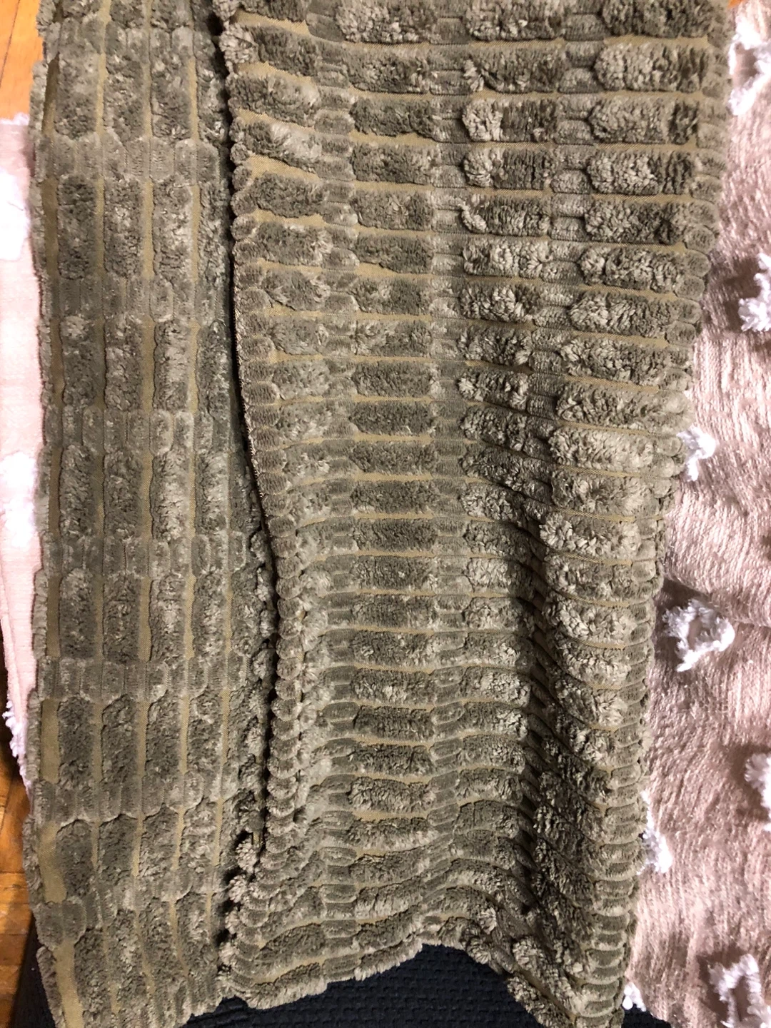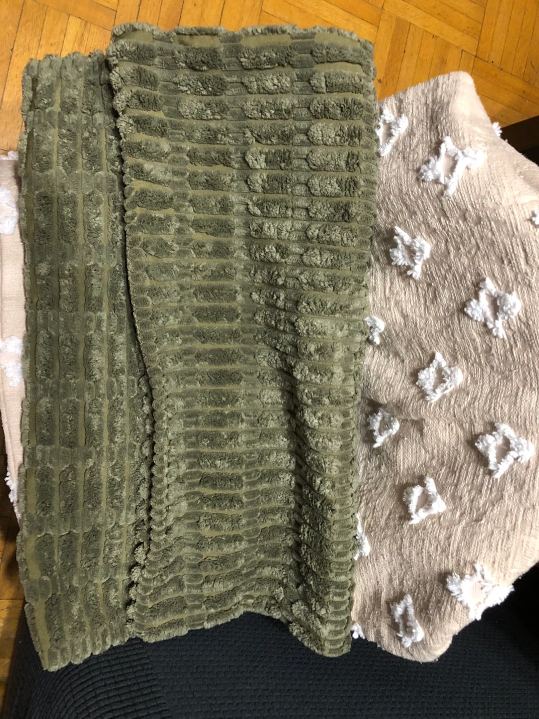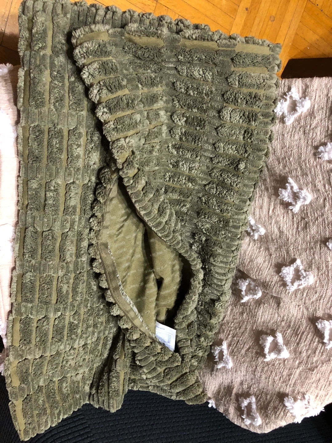 Selling a new set of decorative throw pillow covers. One is a textured olive green, and another is a light pink with white tufted details. Great for adding some cozy texture to your living space!
