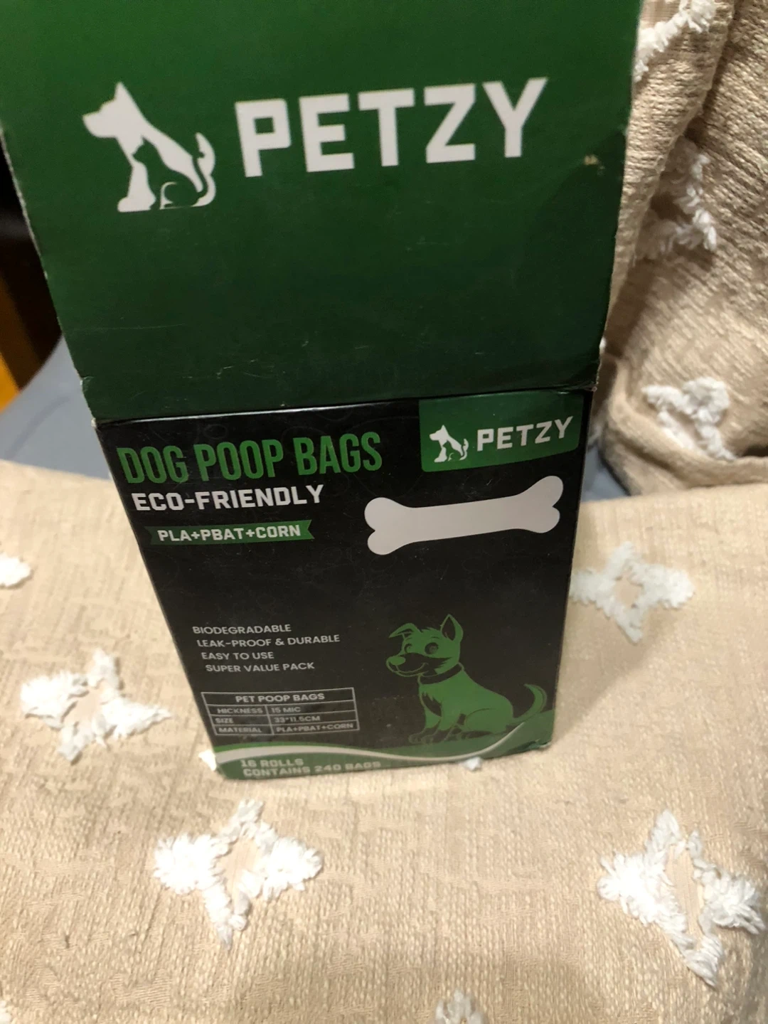 I'm selling a brand new box of Petzy dog poop bags! The box contains 16 rolls, which is a total of 240 bags. These bags are eco-friendly, biodegradable, leak-proof, and durable. The bags are made of PLA+PBAT+Corn and each bag measures 33 x 11.5cm. Super value pack!
