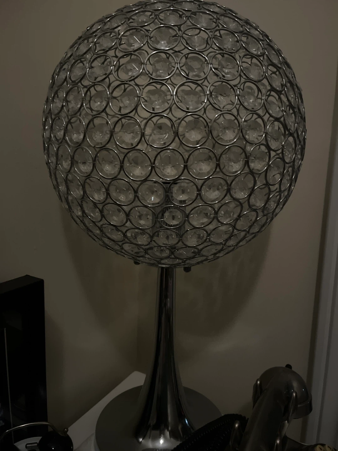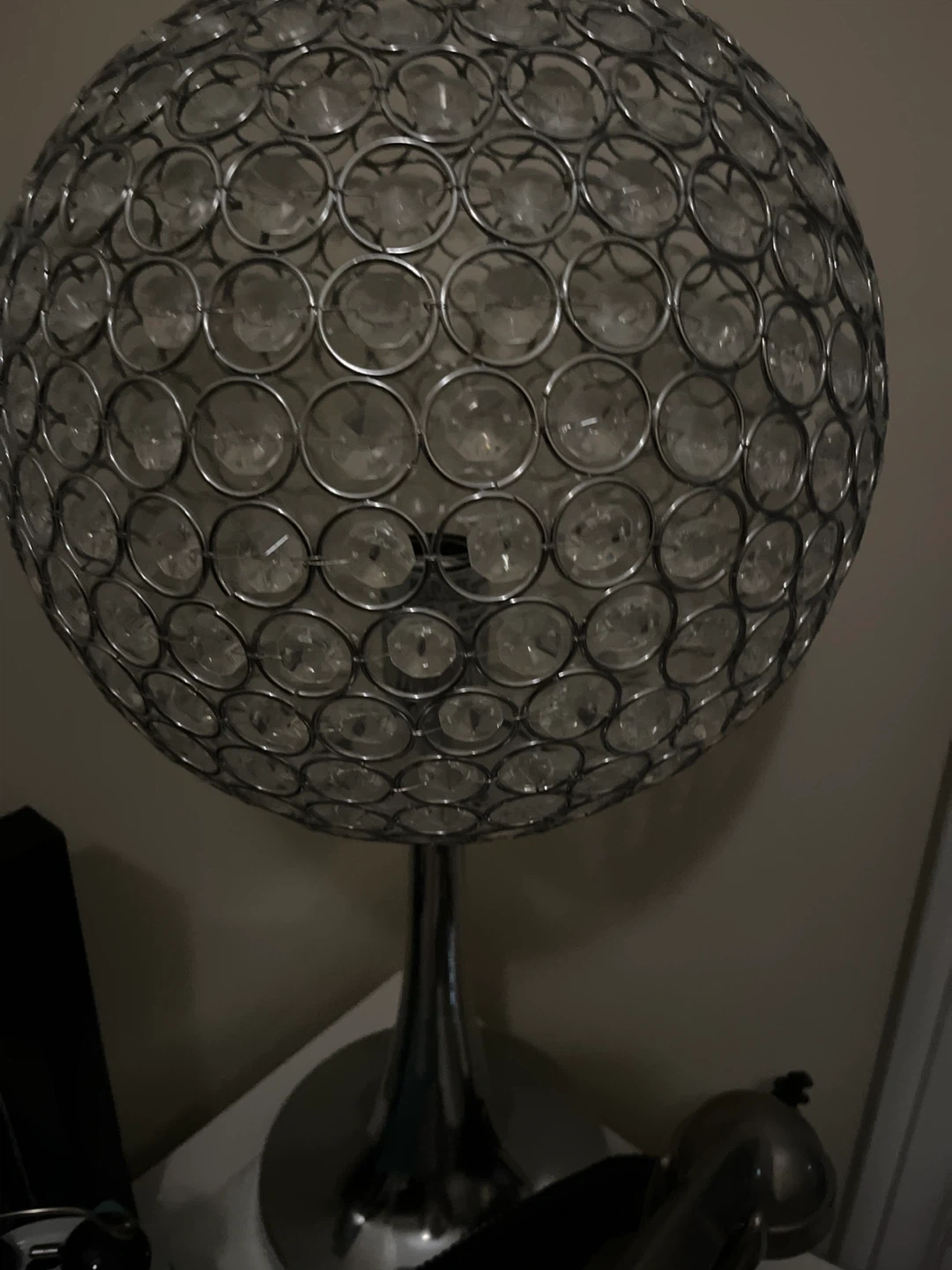 Selling a unique crystal ball table lamp! It adds a touch of elegance to any room. The lamp features a spherical design adorned with clear crystals, creating a beautiful lighting effect. Perfect for a bedside table, desk, or living room accent