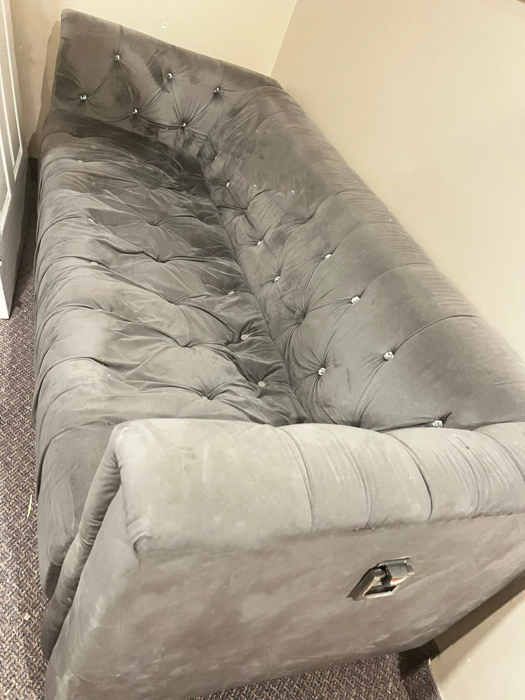 Selling a lovely grey tufted sofa. It's in good condition and would look great in any living room or den. The sofa features button-tufted detailing and nailhead trim along the arms. It's a comfortable and stylish piece!