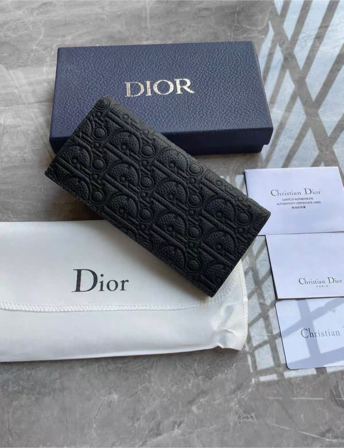 Selling a Dior long wallet in black leather. It's in great condition and comes with its original box. Perfect for keeping your cards and cash organized!