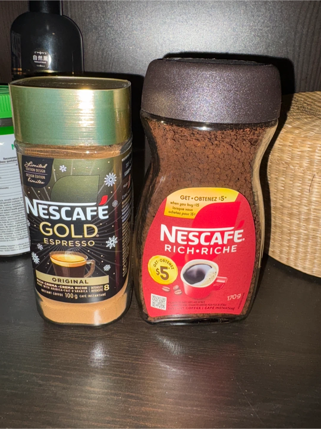 Selling two jars of Nescafe instant coffee! One is the Gold Espresso (100g) and the other is Rich (170g). Great for a quick and easy caffeine fix!