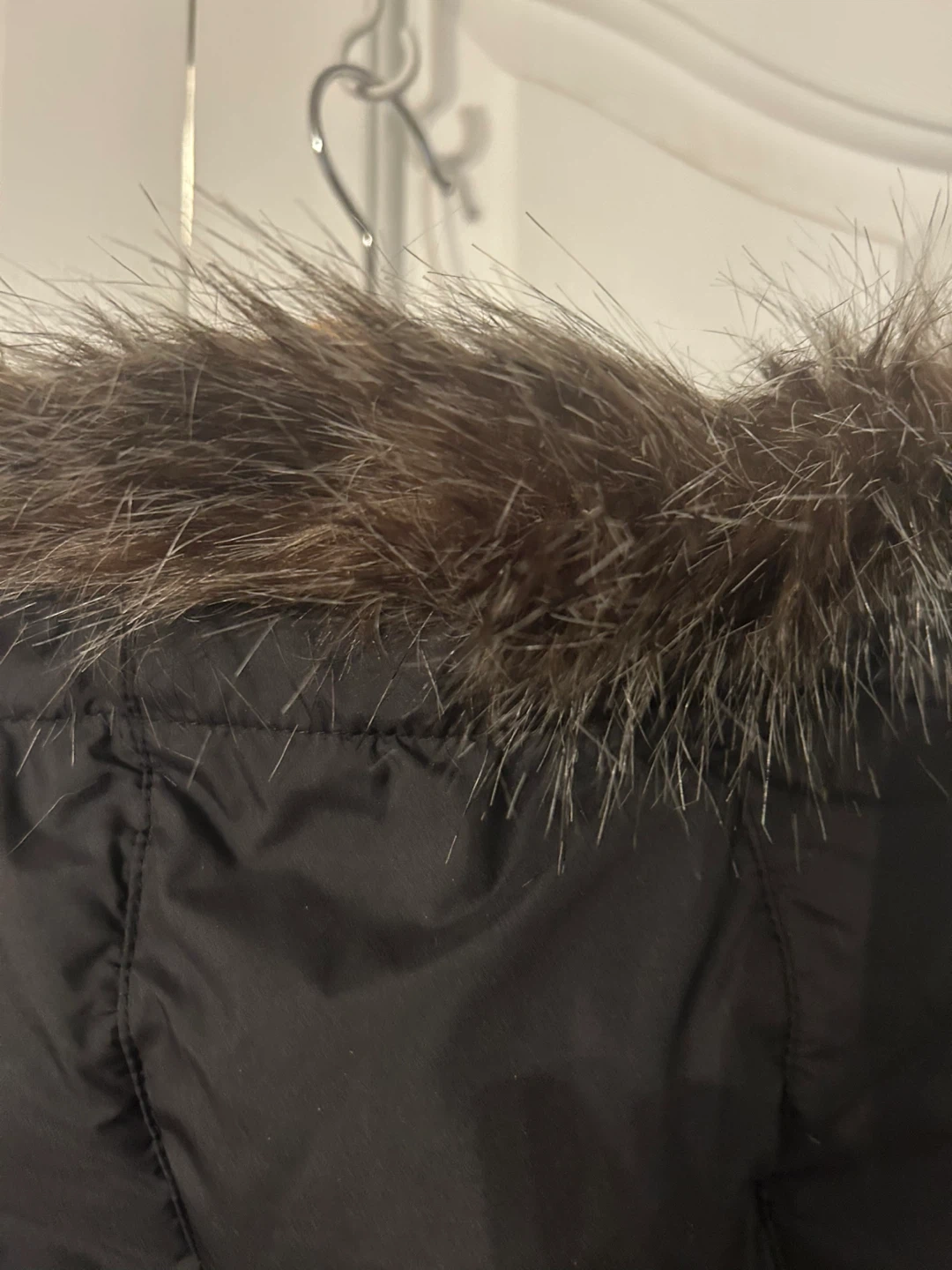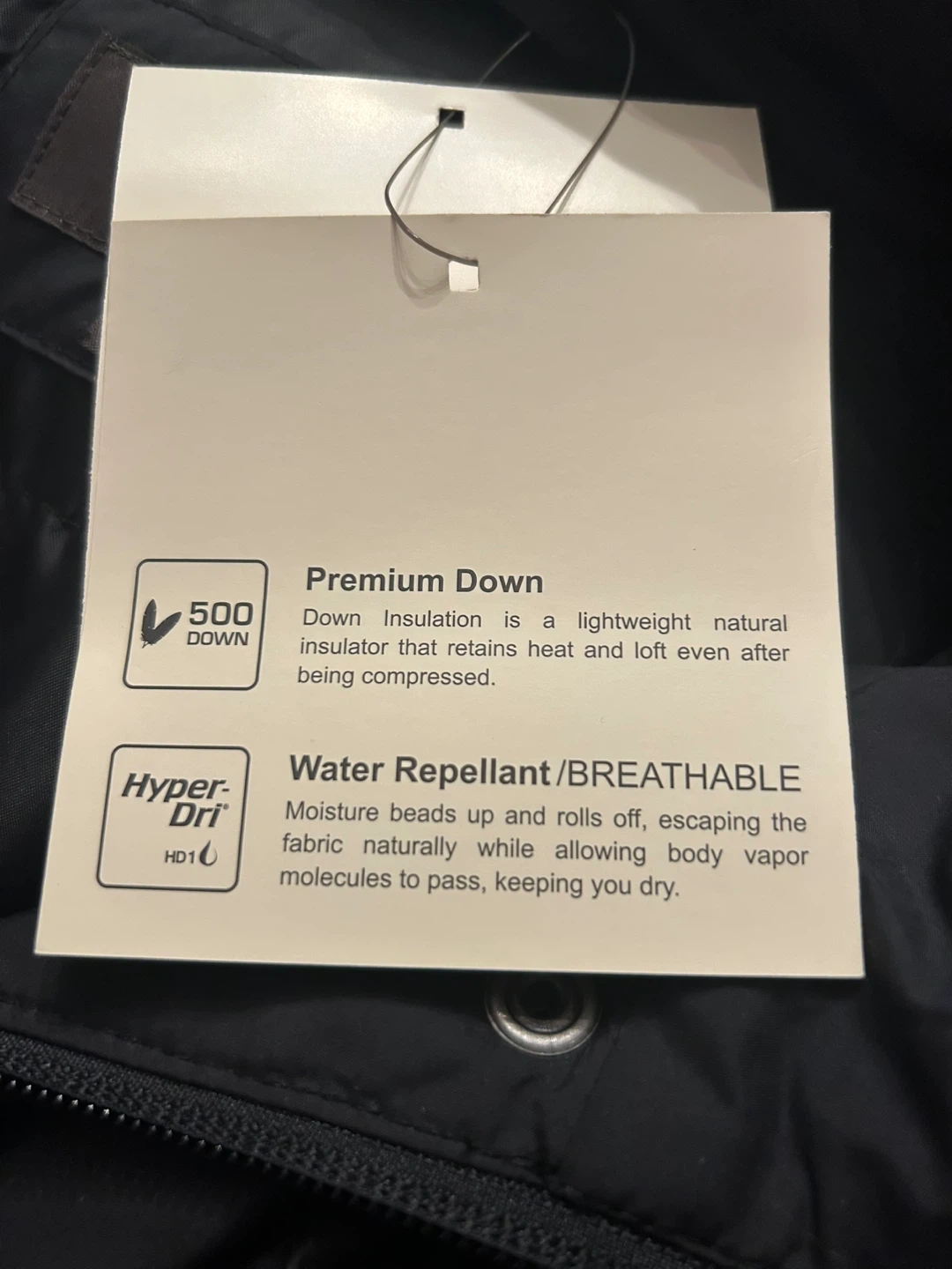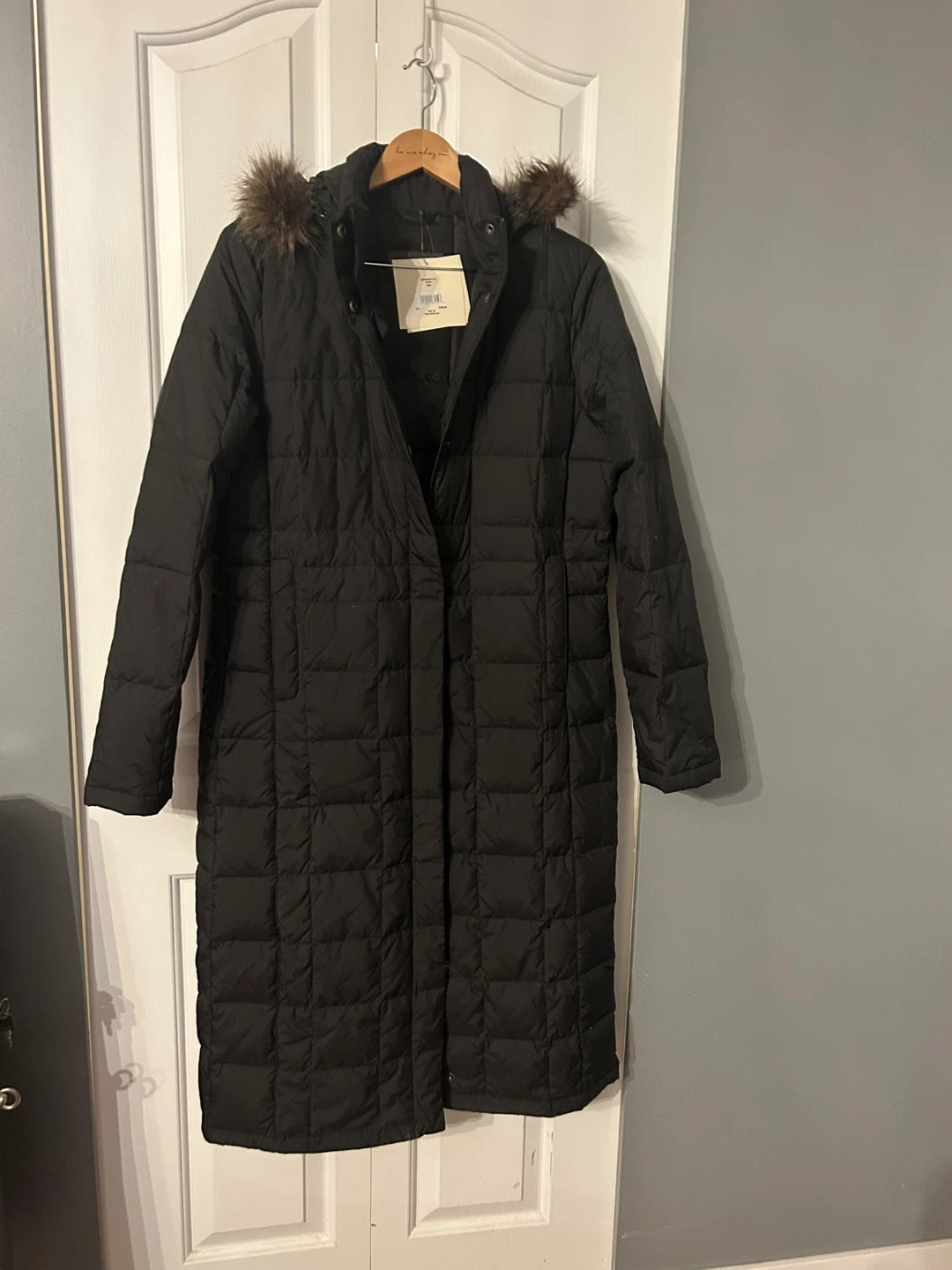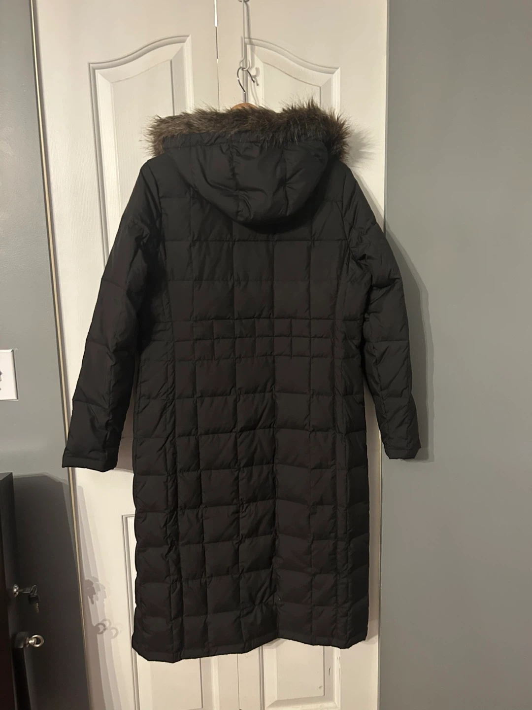 Full length black down coat size large Down insulation is a lightweight natural insulator that retains heat and lift even after being compressed Water repellent/breathable Moisture beads up and rolls off, escaping the fabric naturally while allowing body Vapor molecules to pass, keeping you dry