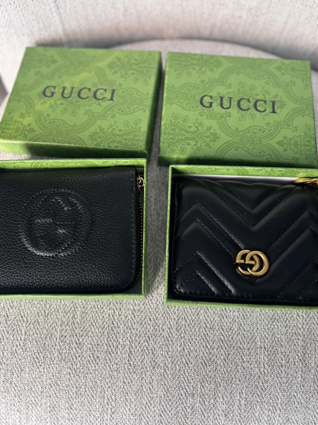 Gucci wallets in black leather. Both come with their boxes! One wallet features the Gucci logo embossed on the front, and the other has a quilted design with the gold GG logo. Great condition and ready for a new owner