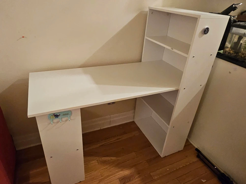 Selling a white desk with built-in shelves! It's in good condition and perfect for a small workspace or student. The desk is 118 cm (46.45 inches) wide and 51.5 cm (20.27 inches) deep. The shelving unit is 120 cm (47.24 inches) tall and 25 cm (9.8 inches) deep. There are also some hooks on the side for extra storage