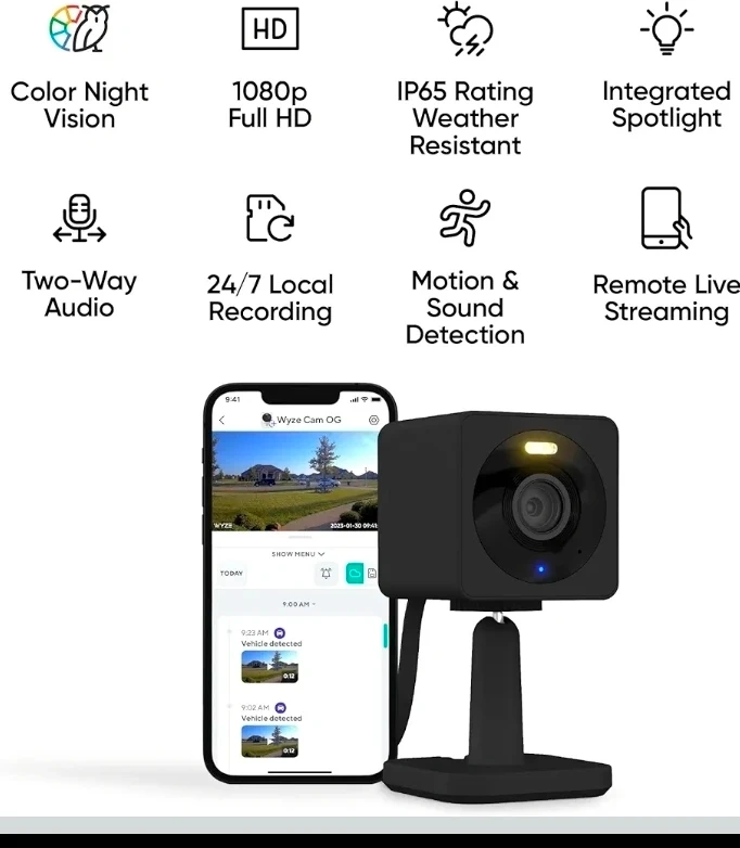 WYZE Cam OG Indoor/Outdoor 1080p Wi-Fi Smart Home Security Camera with Color Night Vision, Built-in Spotlight, Motion Detection, 2-Way Audio, Compatible with Alexa & Google, Black, Free Expert Setup