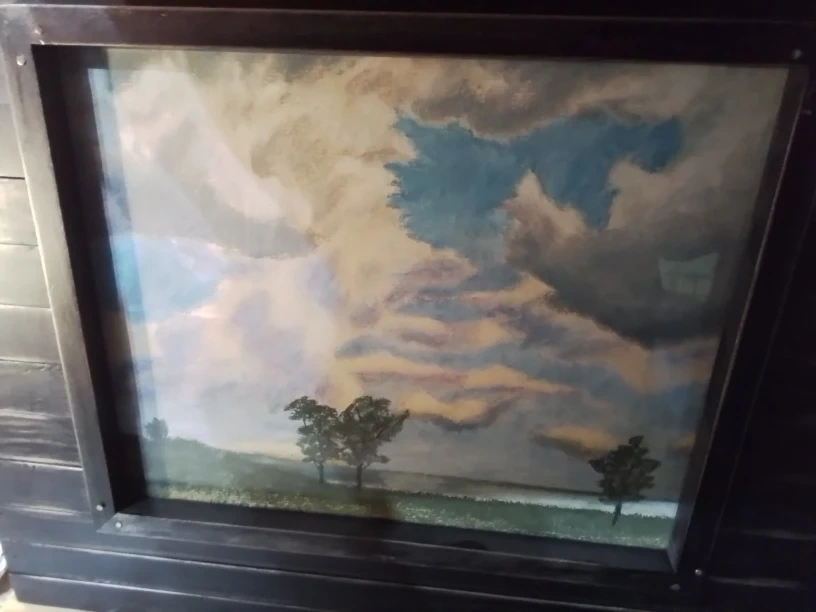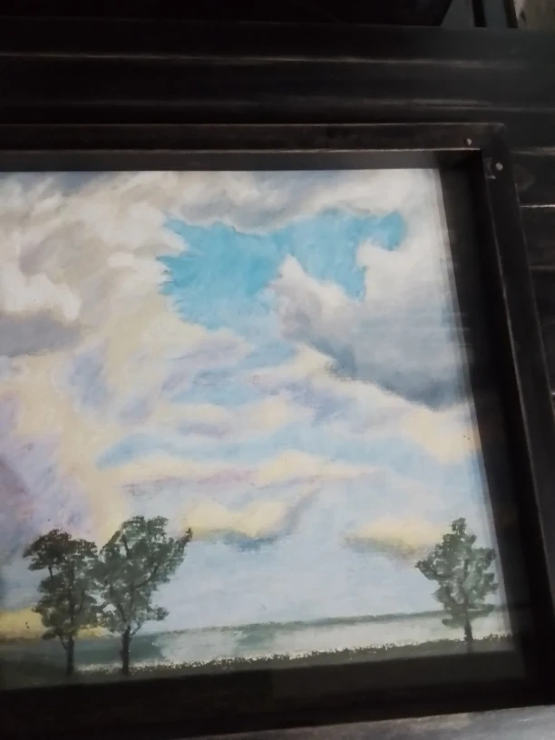 Add a touch of rustic charm to your home with this framed pastel painting, sized at 15x12 inches. The artwork features a serene landscape with trees under a cloudy sky, encased in a unique, weathered wooden frame that enhances its appeal. This beautiful piece is sure to bring a calming presence to any room.