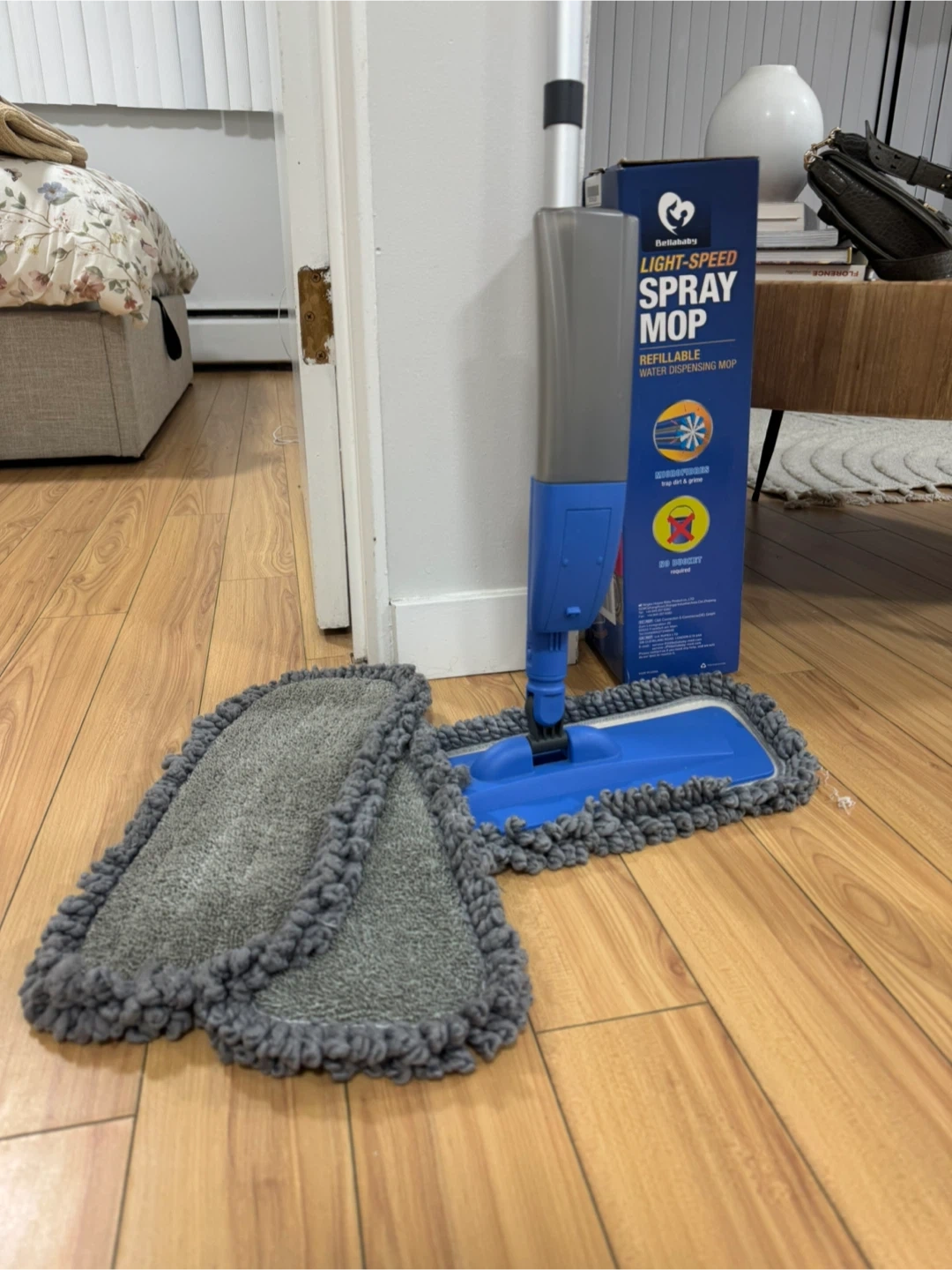 I'm selling a BellaBaby Light-Speed Spray Mop! It's a refillable water dispensing mop that's convenient and easy to use.