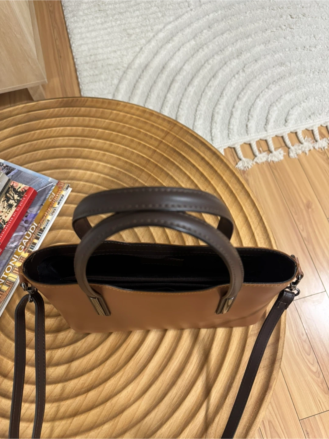 A stylish brown leather tote bag that's perfect for everyday use! It features both handles and a shoulder strap for versatile carrying options. The bag is in great condition and ready for a new owner!