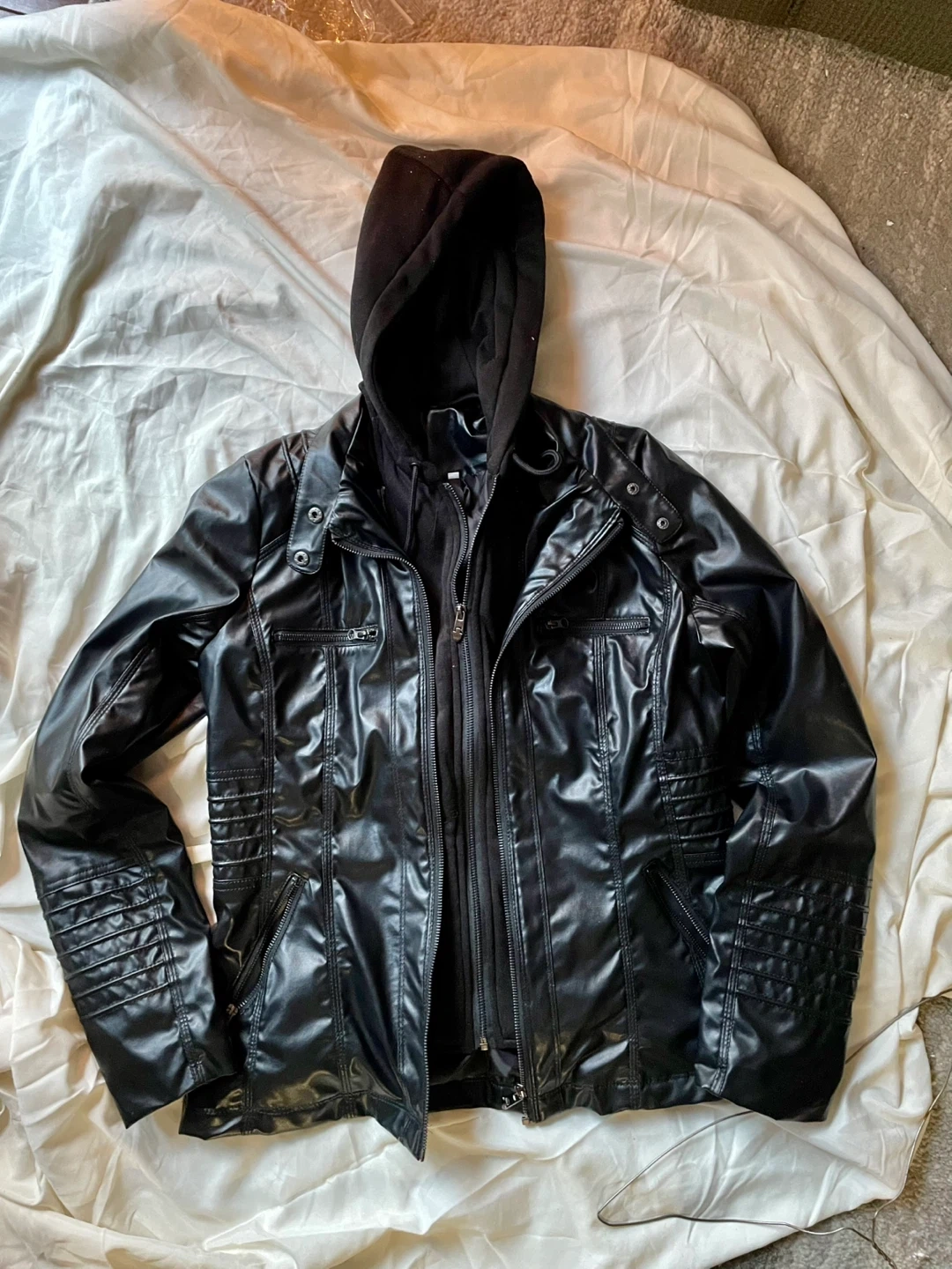 Selling a black faux leather jacket with a hood. Hood is removable,It's in great condition and perfect for adding a bit of edge to your wardrobe. The jacket features a zip-up front and stylish detailing on the sleeves and back. It's a versatile piece that can be dressed up or down! Inner zipper and outer zipper