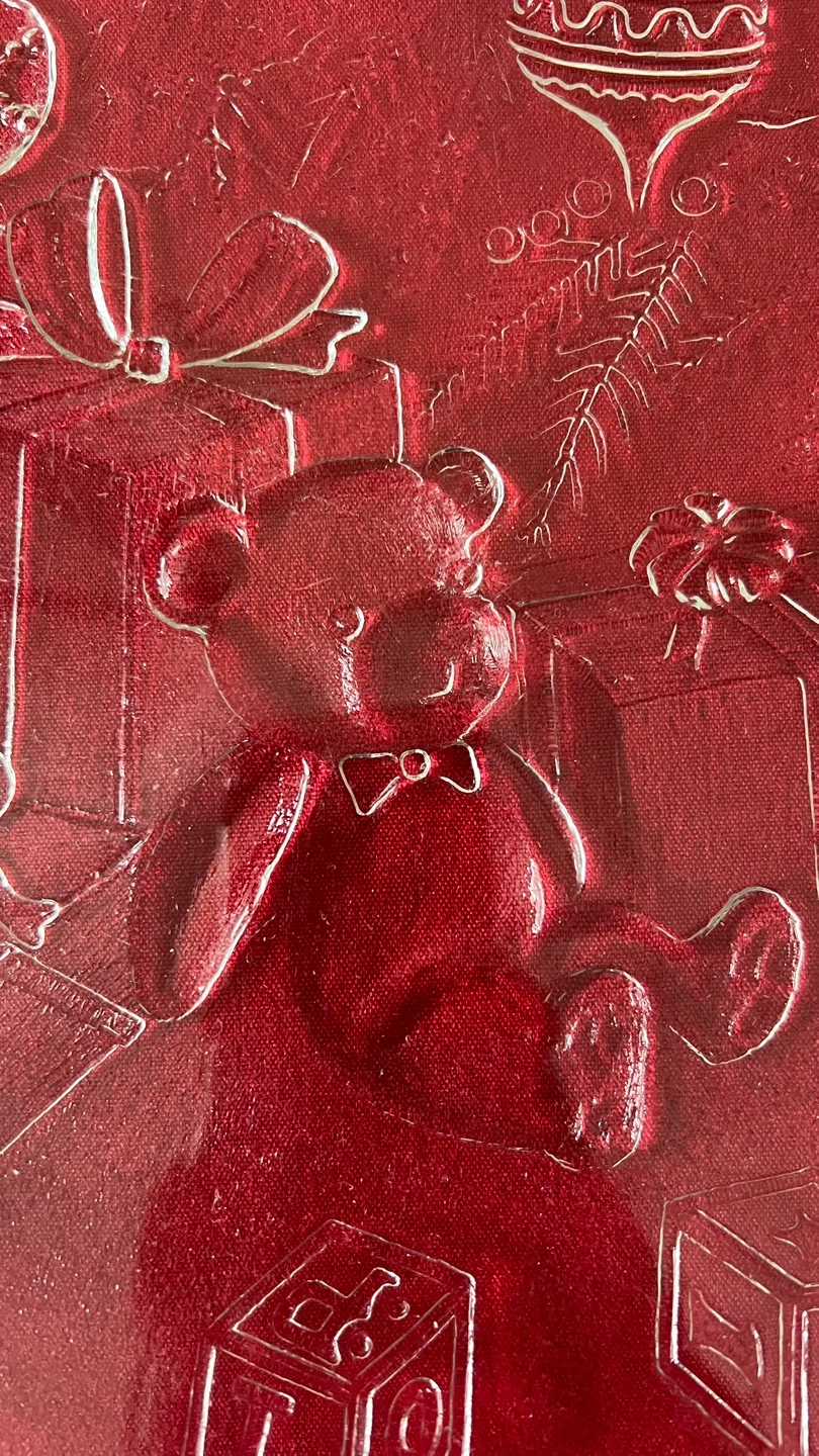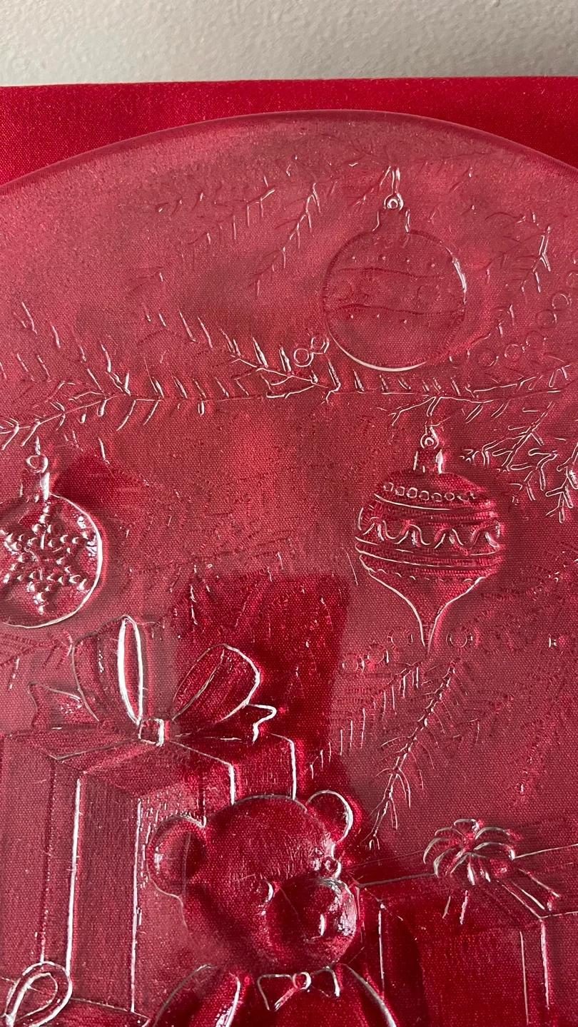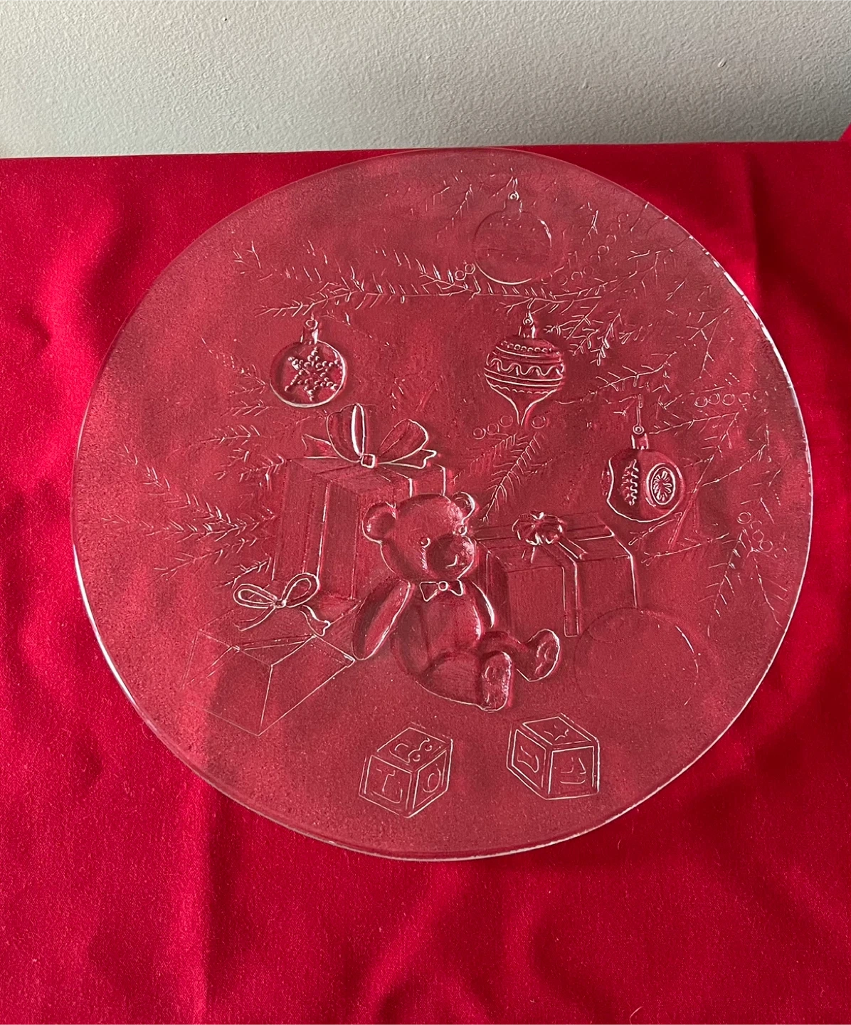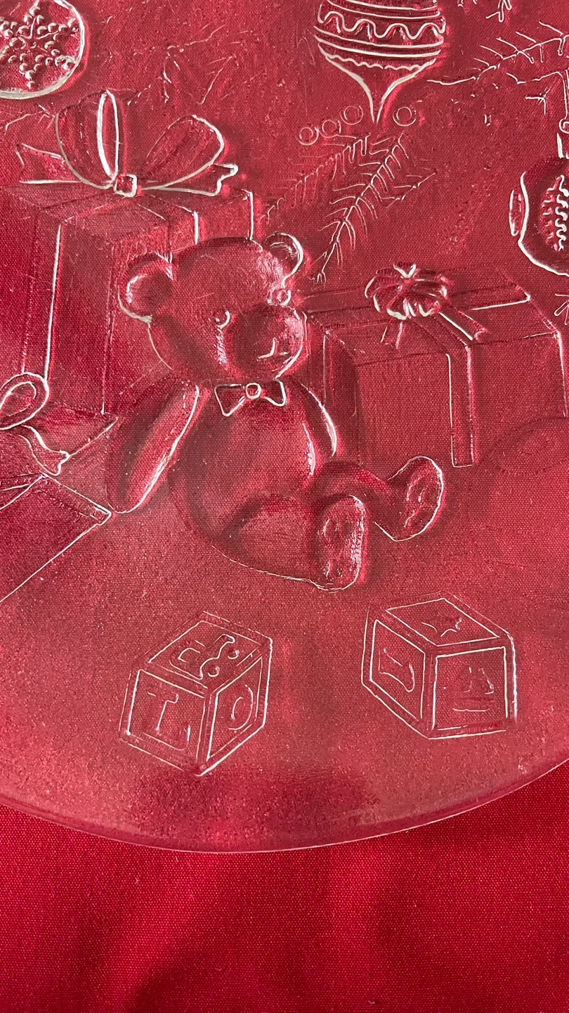 Clear glass plate features embossed etchings of a teddy bear under a Christmas tree, surrounded by presents, toy blocks, and ornaments on tree branches.