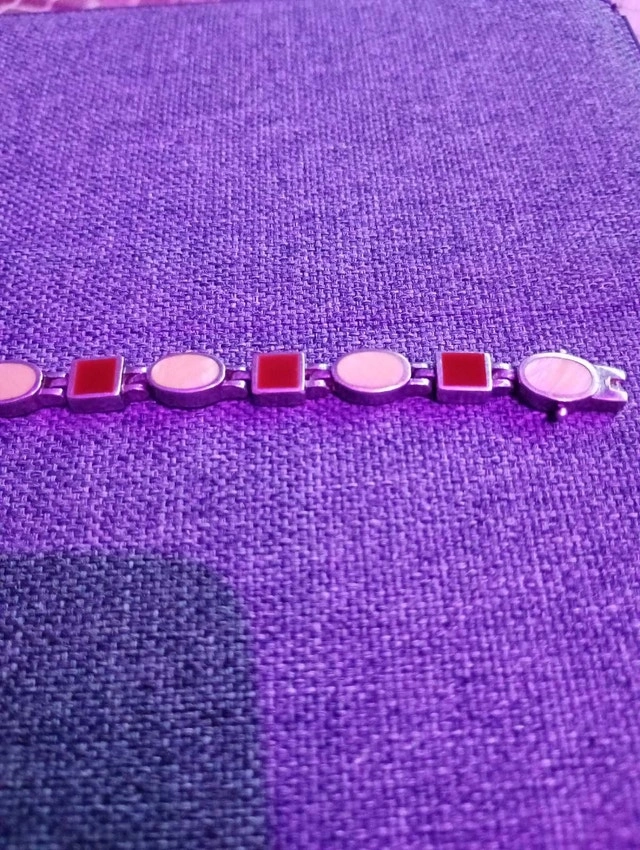This is a vintage Mexican Modernist sterling silver and red jasper link bracelet. The bracelet has 925 markings and passed an acid test. The price is firm.