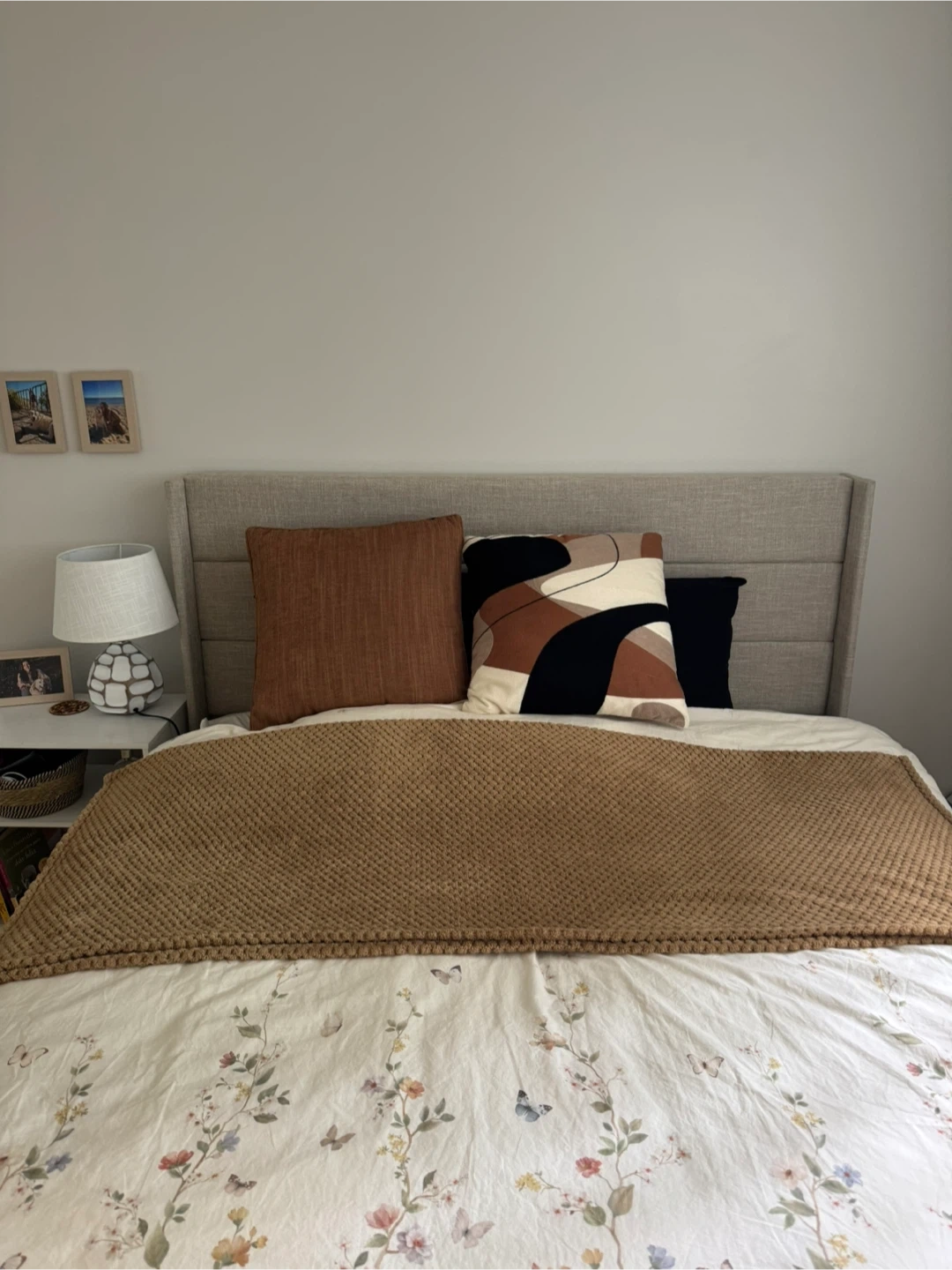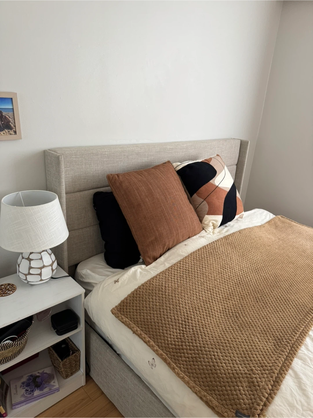 Selling a bedroom set including a bed frame, side table, and a Sleep Country mattresses(2 years old). The set includes a neutral-toned bed frame with storage (hydrolyc mechanism)