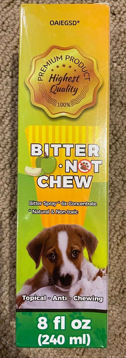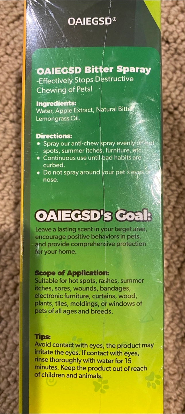 Selling a bottle of OAIEGSD Bitter Spray designed to effectively stop destructive chewing in pets. This topical anti-chewing spray is a natural and non-toxic formula with 6x concentrate. It comes in an 8 fl oz (240 ml) bottle and is suitable for hot spots, rashes, summer itches, sores, wounds, bandages, electronic furniture, curtains, wood, plants, tiles, moldings, or windows of pets of all ages and breeds. The ingredients include water, apple extract, natural bitter, and lemongrass oil. Perfect for curbing those bad habits!