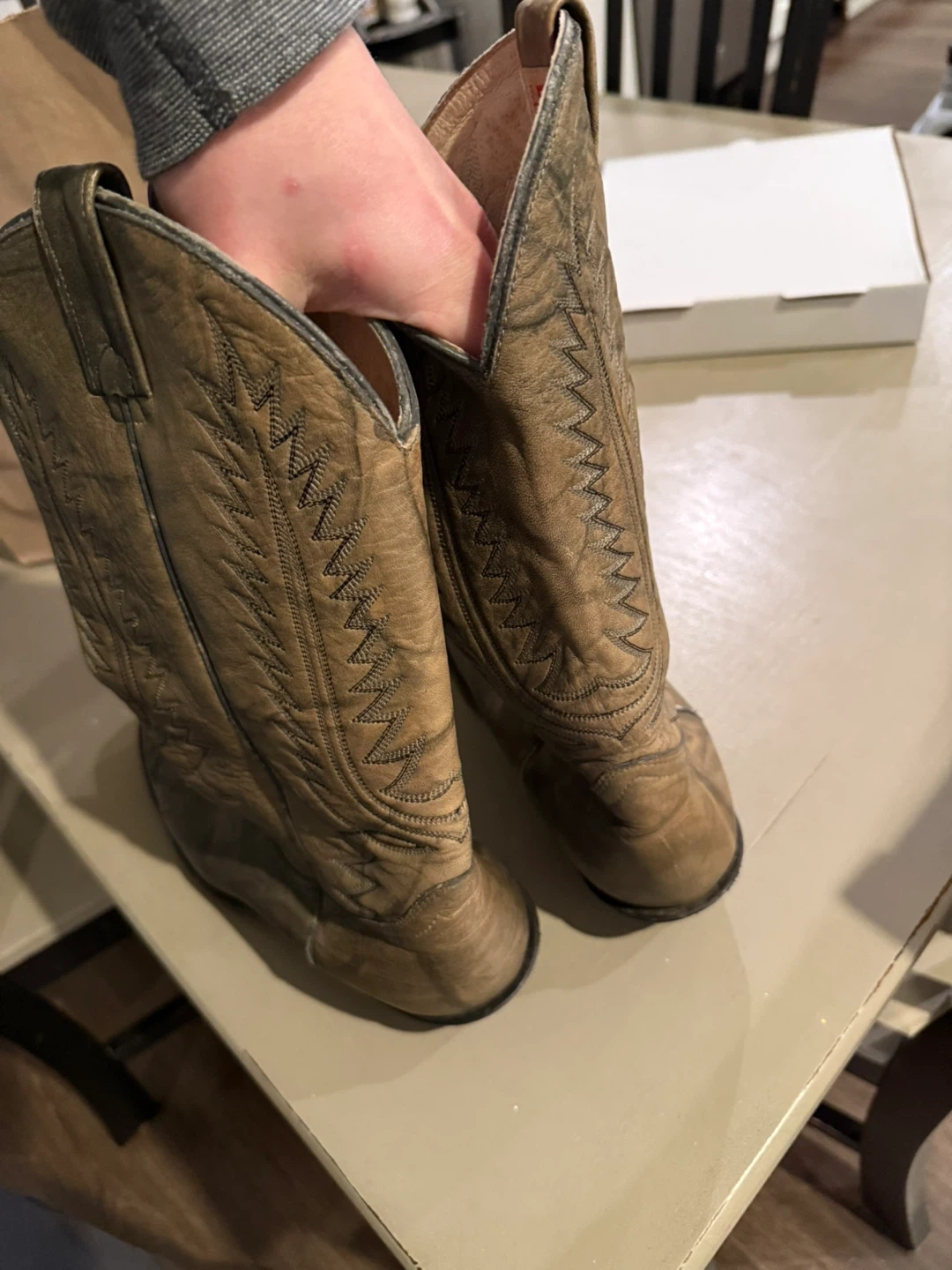 Selling a pair of used cowboy boots. They show some signs of wear, as you can see in the photos. Great for a western-themed event or everyday wear if you're into that style! Please note that the size is not indicated, but I know it’s either 9 or 9.5. Im size 10 and I can wear but they are pretty snug
