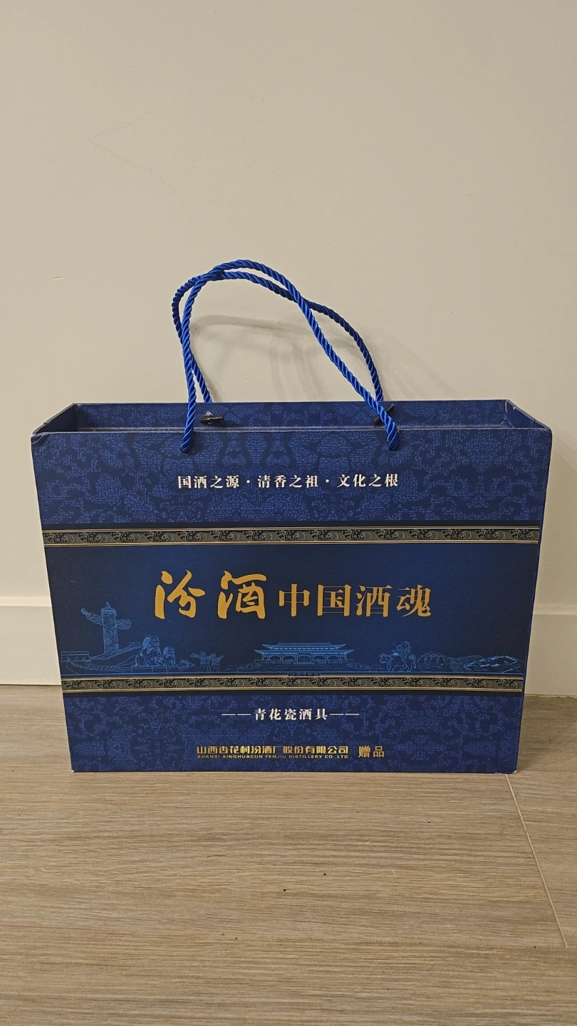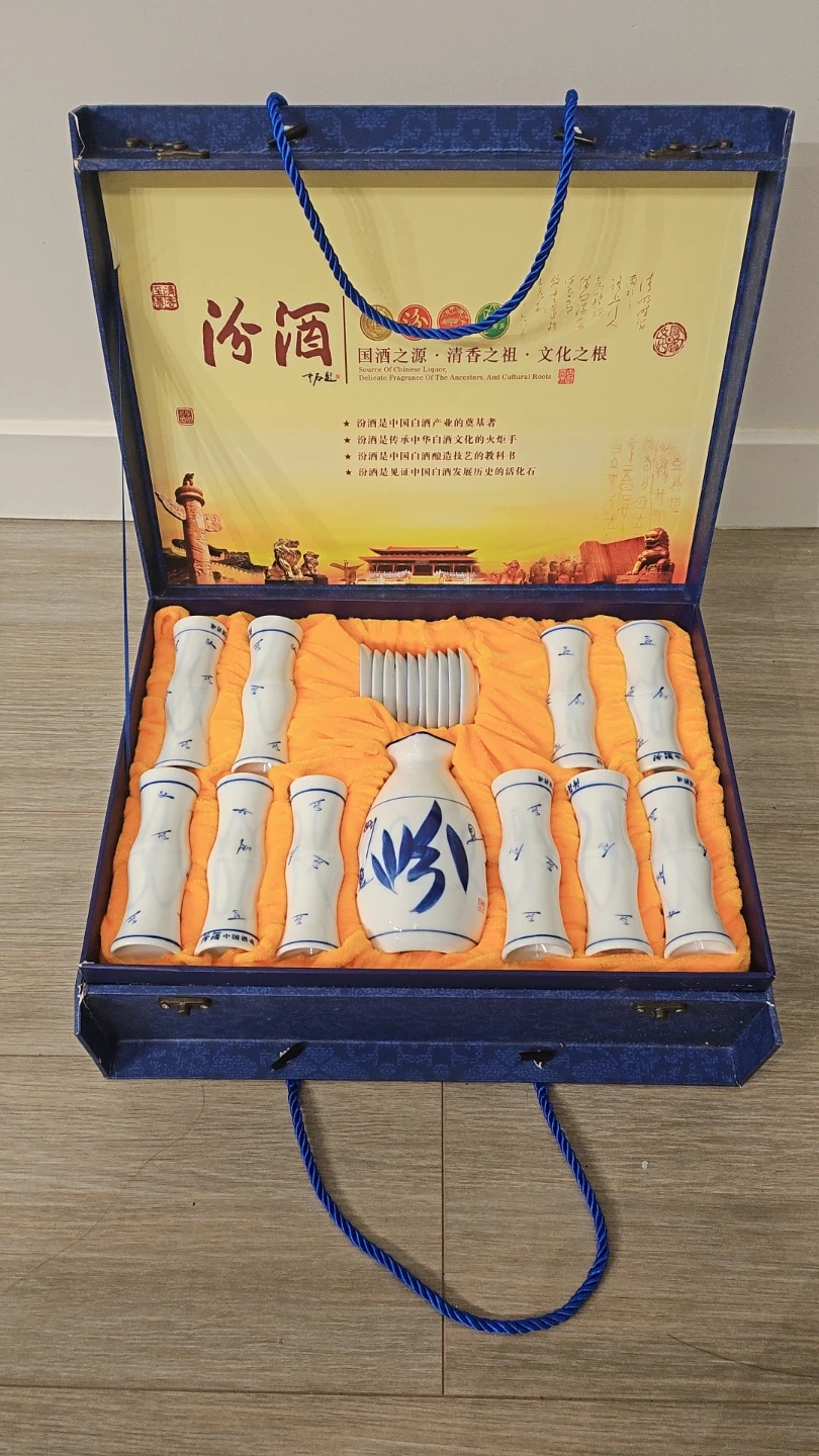 This is a Chinese Baijiu liquor set. It comes in a beautiful blue box with a carrying handle. Inside, you'll find a bottle and several small cups, all in excellent condition. Perfect for enjoying traditional Chinese spirits!