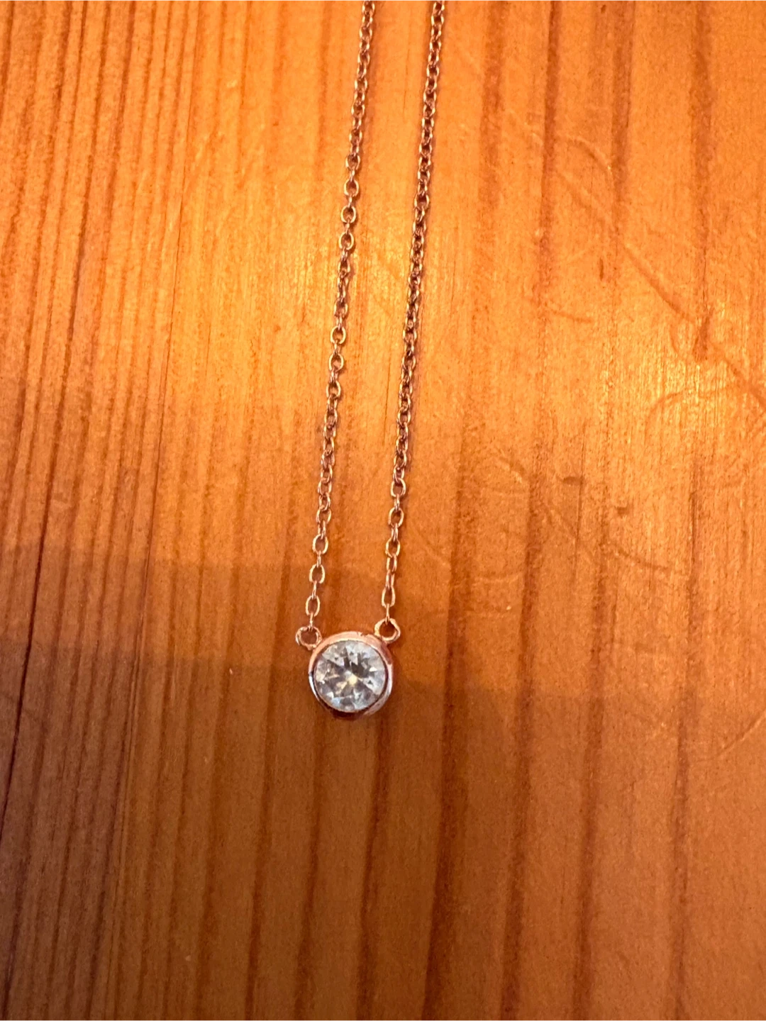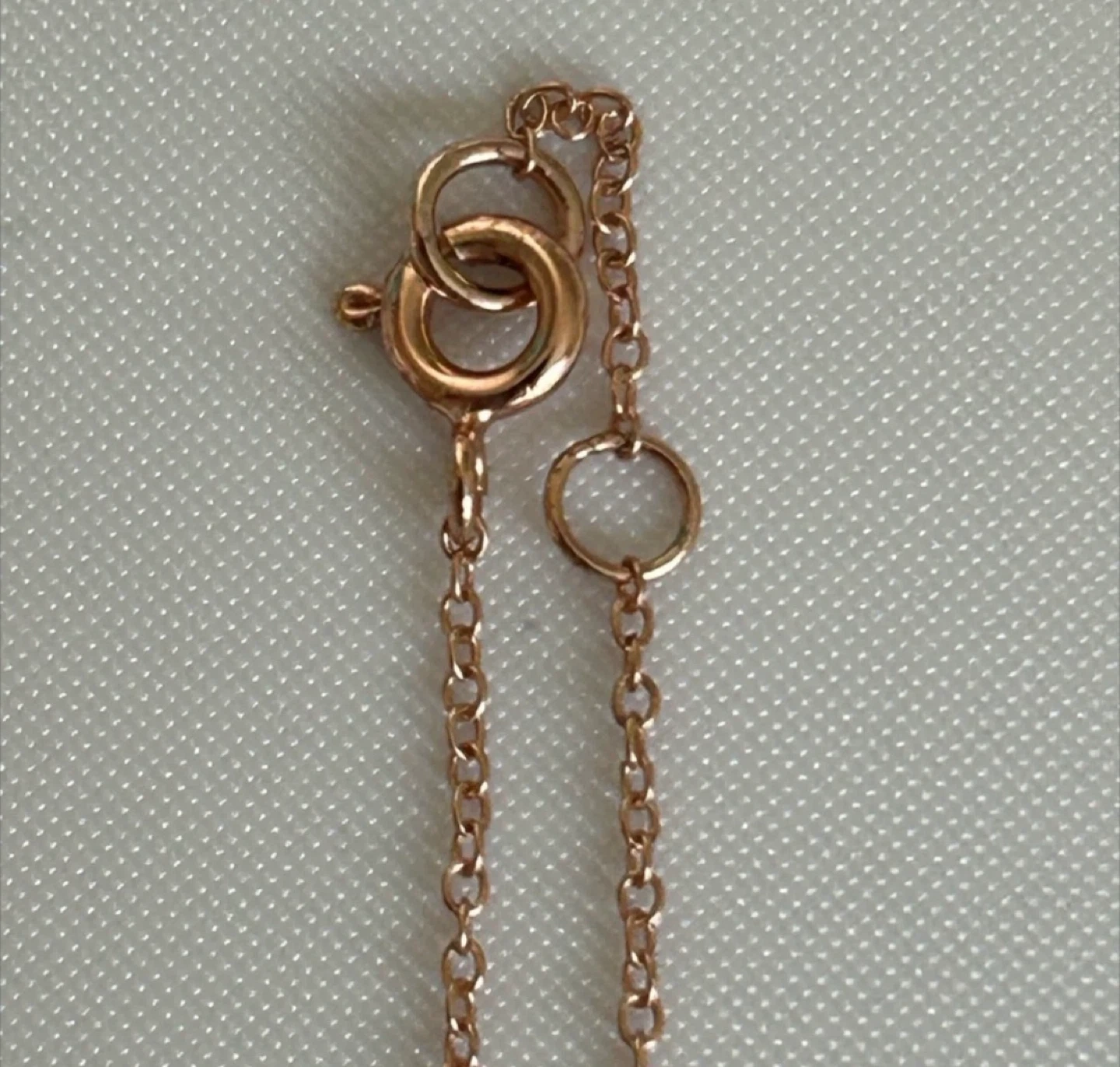 Brand new, never used. 14k ROSE GOLD plated over 925 sterling silver (base mental, so NOT just costume jewelry), with a good sized cubic zirconia pendant, and measures 16.5” end to end, with adjustable chain at 16” as well.