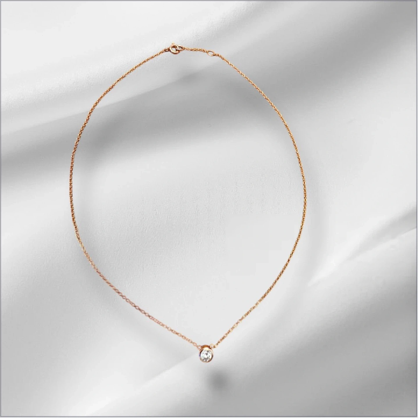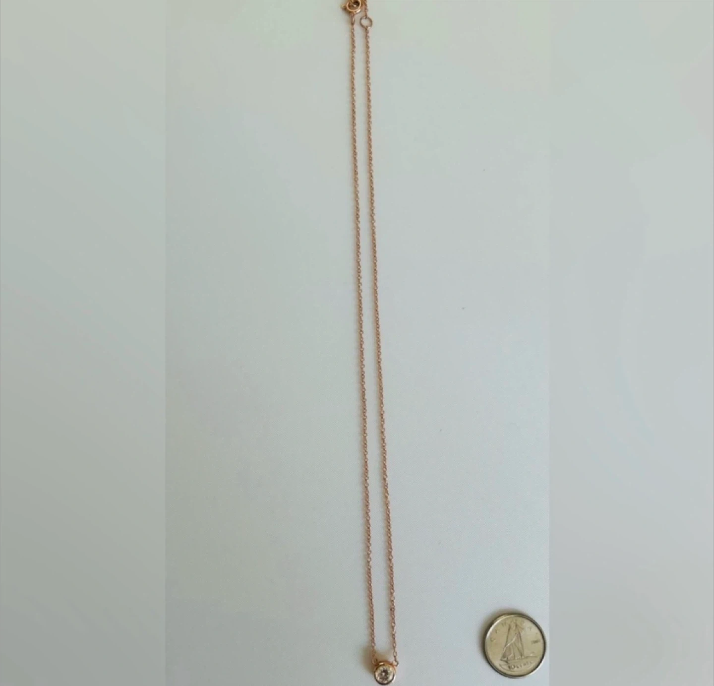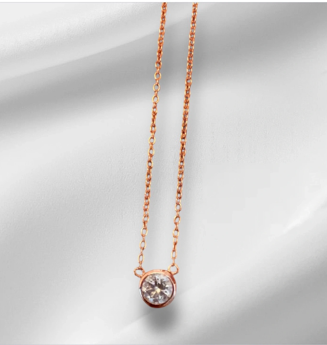 Brand new, never used. 14k ROSE GOLD plated over 925 sterling silver (base mental, so NOT just costume jewelry), with a good sized cubic zirconia pendant, and measures 16.5” end to end, with adjustable chain at 16” as well.
