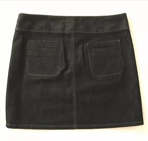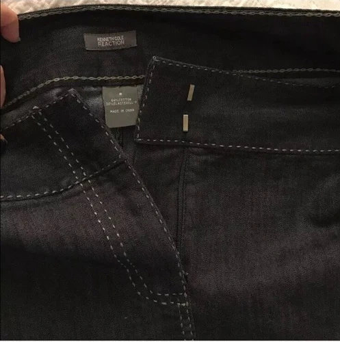 Kenneth Cole Reaction denim skirt, size 8, new without tags. Very light and dark blue. Good for every season. Two pockets on the back. 64% cotton, 36% elasterell-p. Brand new, never been worn.