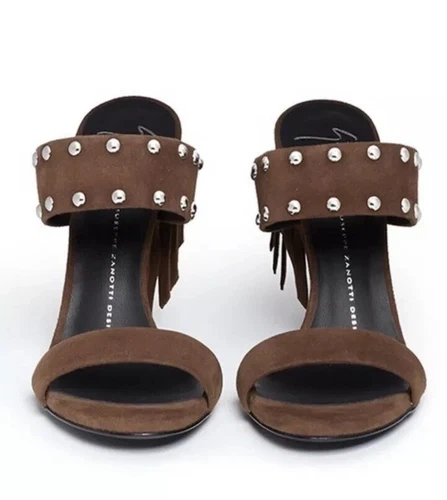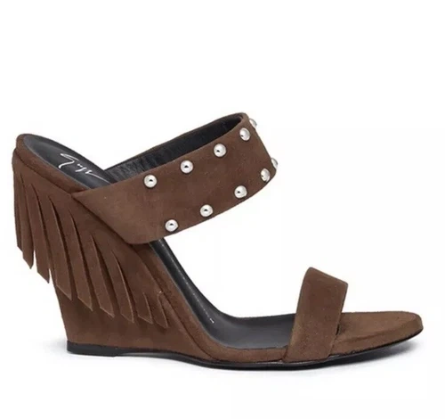 Brand new with box. Size EUR 37 US 7 . Punctuated with fringes at the heel for recognisable bohemian attitude, these Taline sandals from Giuseppe Zanotti Design are sumptuously crafted from suede to luxe up casual formulas. Adding a hint of toughened sensibility with dome studs at the side, this pair will empower any coordination with impactful visuals. Designer colour: Sigaro 4.5" covered wedge heel Brown suede with silver-tone dome studs Fringe trim at counter heel Slip-on style Leather lining, padded leather insole, and leather outsole Shoe box included Made in Italy 100% Leather Upper / 100% Leather Sole MSRP $695+Tax Thank you.