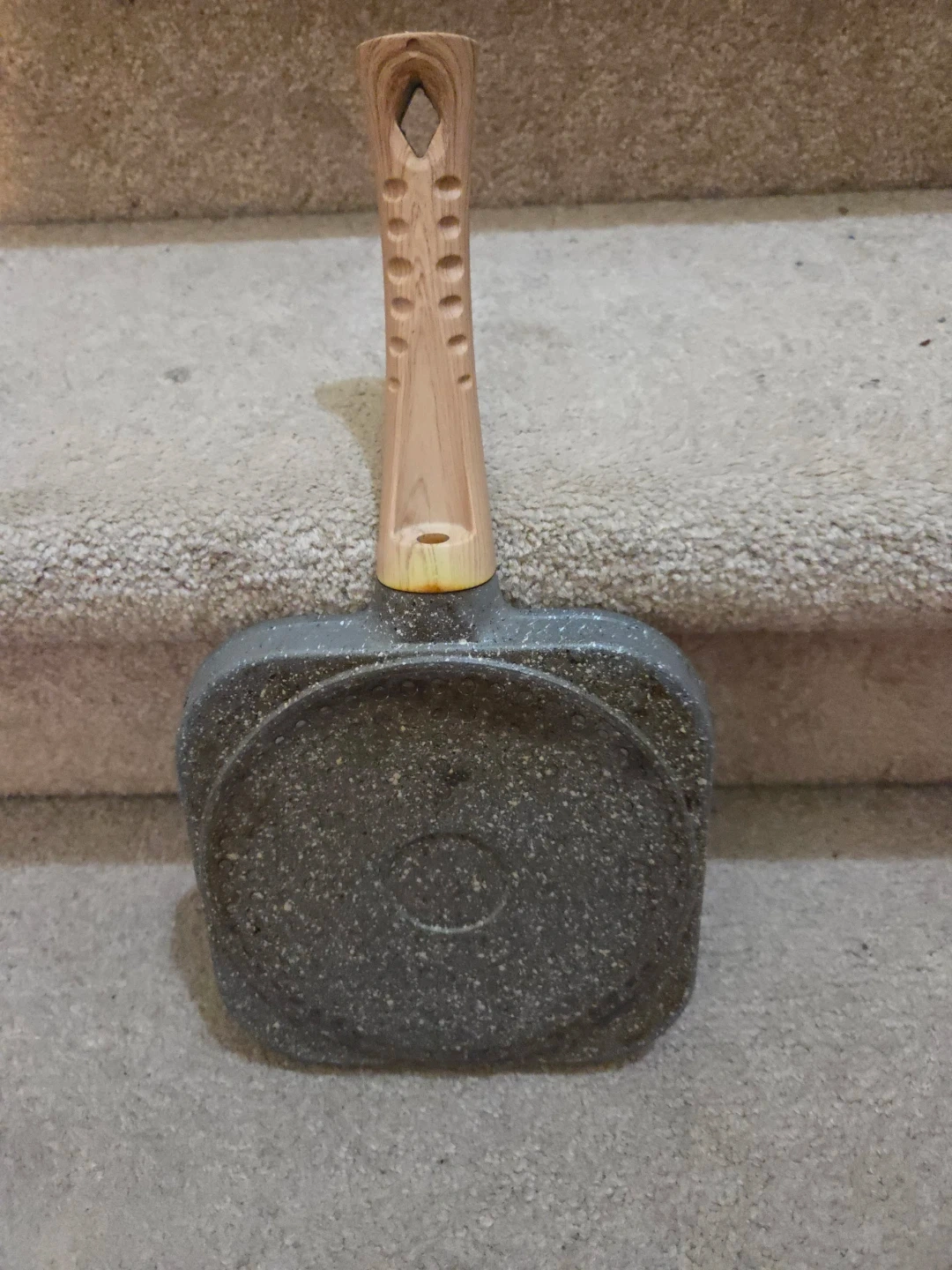 Selling a four-cup egg frying pan with a wood-look handle. It's perfect for making breakfast for the family!