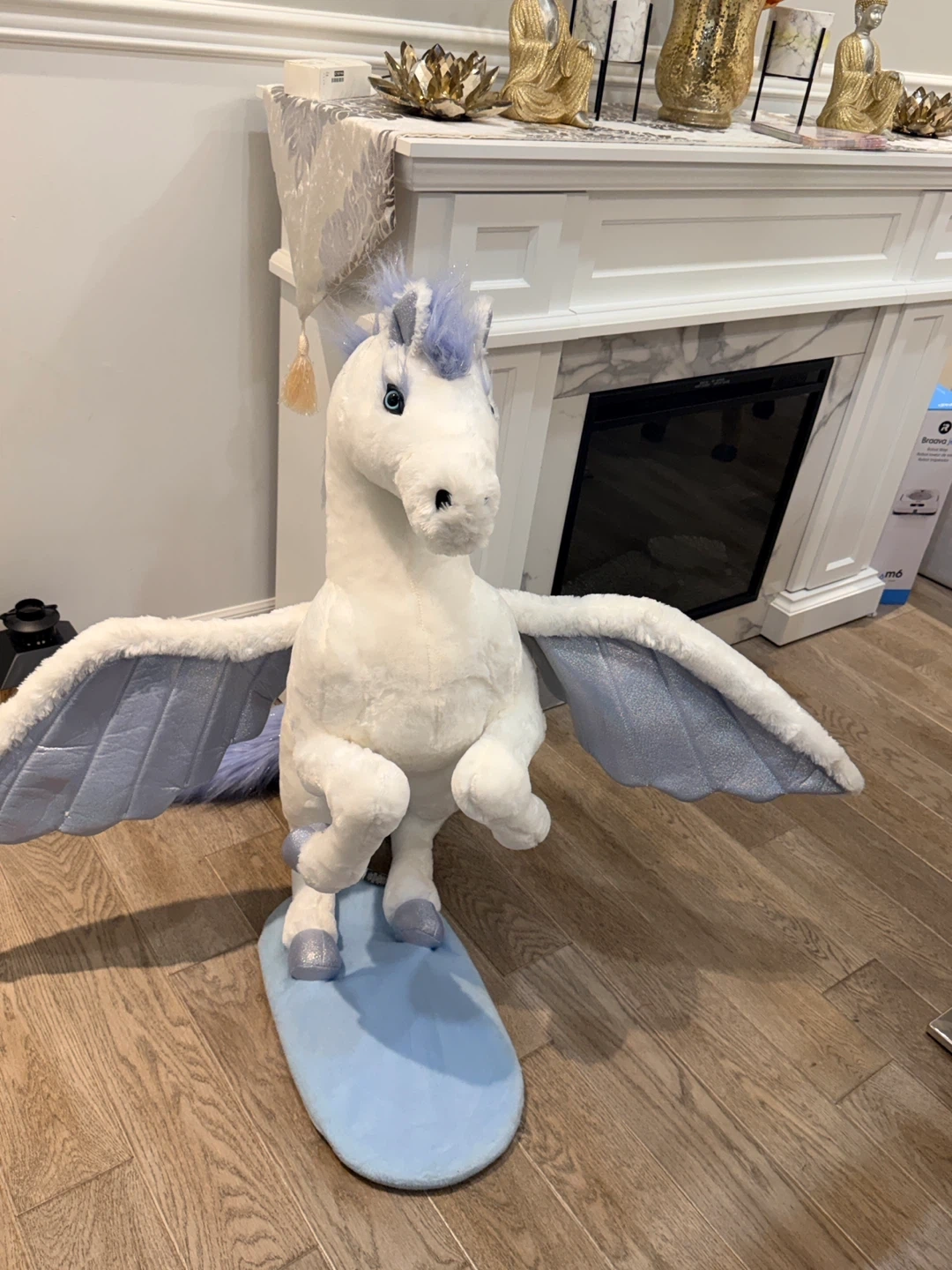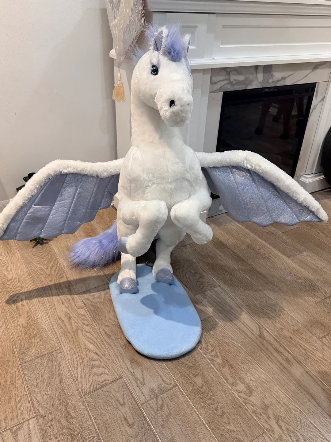 Selling a large, adorable Pegasus plush toy! It's white with purple accents and connected on a light blue base.