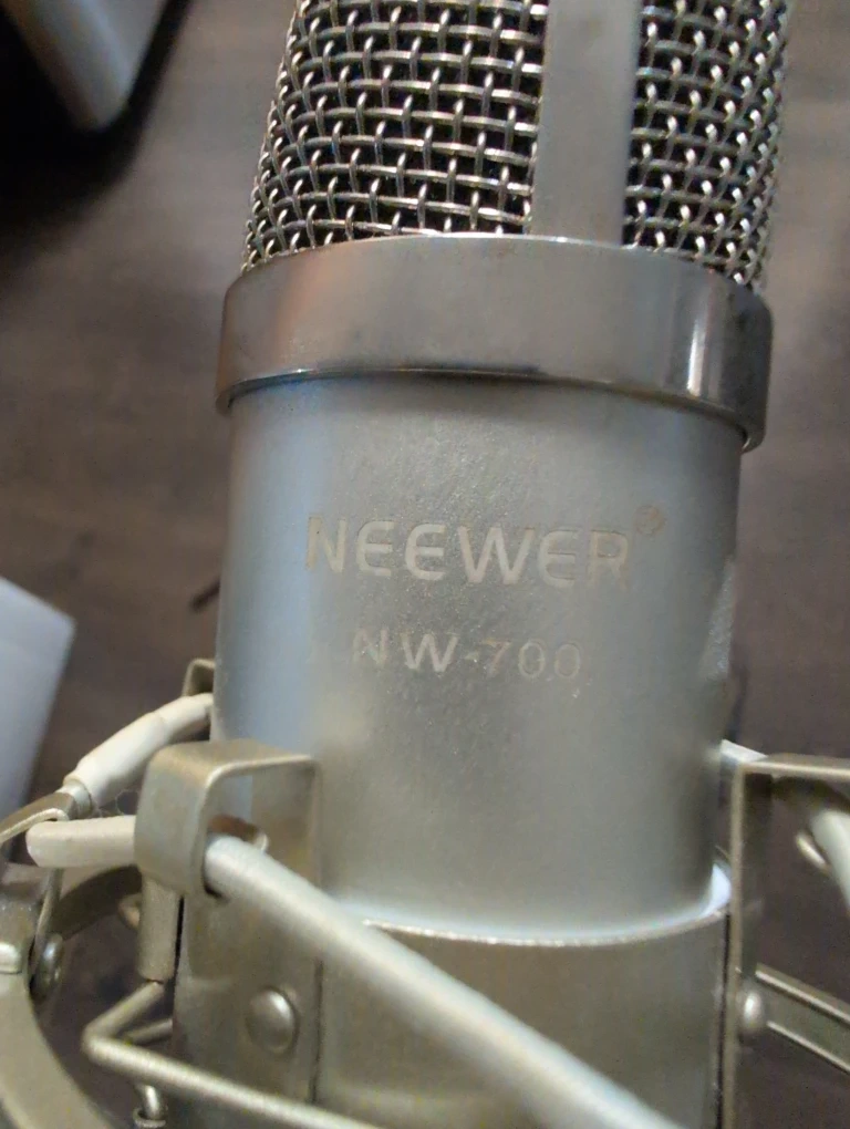 Selling a Neewer NW-700 microphone set for computers. It includes the microphone, a suspension scissor arm stand, a shock mount, a pop filter, and cables. Perfect for getting started with recording!
