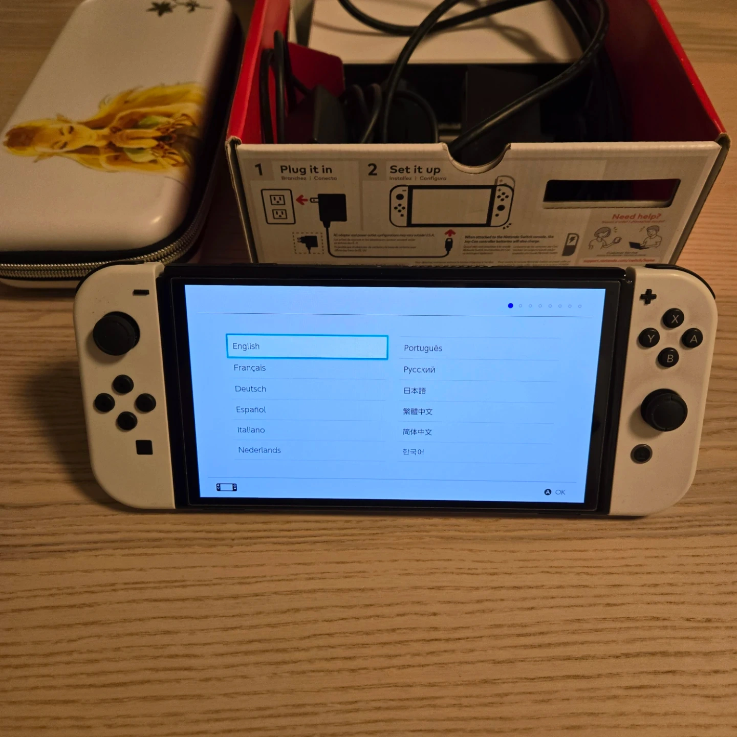 Nintendo Switch OLED. Like new in box with accessories. Includes Dock, power cable, hdmi, joycon grip, zelda case, screen protector installed on switch.