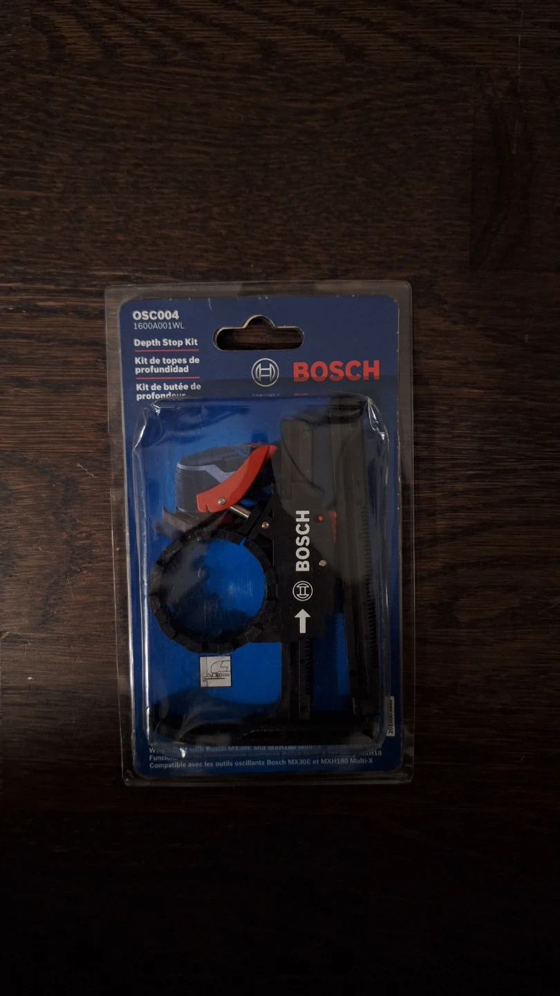 Selling a brand new Bosch OSC004 Depth Stop Kit, still sealed in its original packaging! This kit allows you to set cutting depth from 1mm to 16mm and also serves as a guide for more easily followed marks. It includes the mounting bracket, straight depth stop, and curved depth stop. Great for precision work!