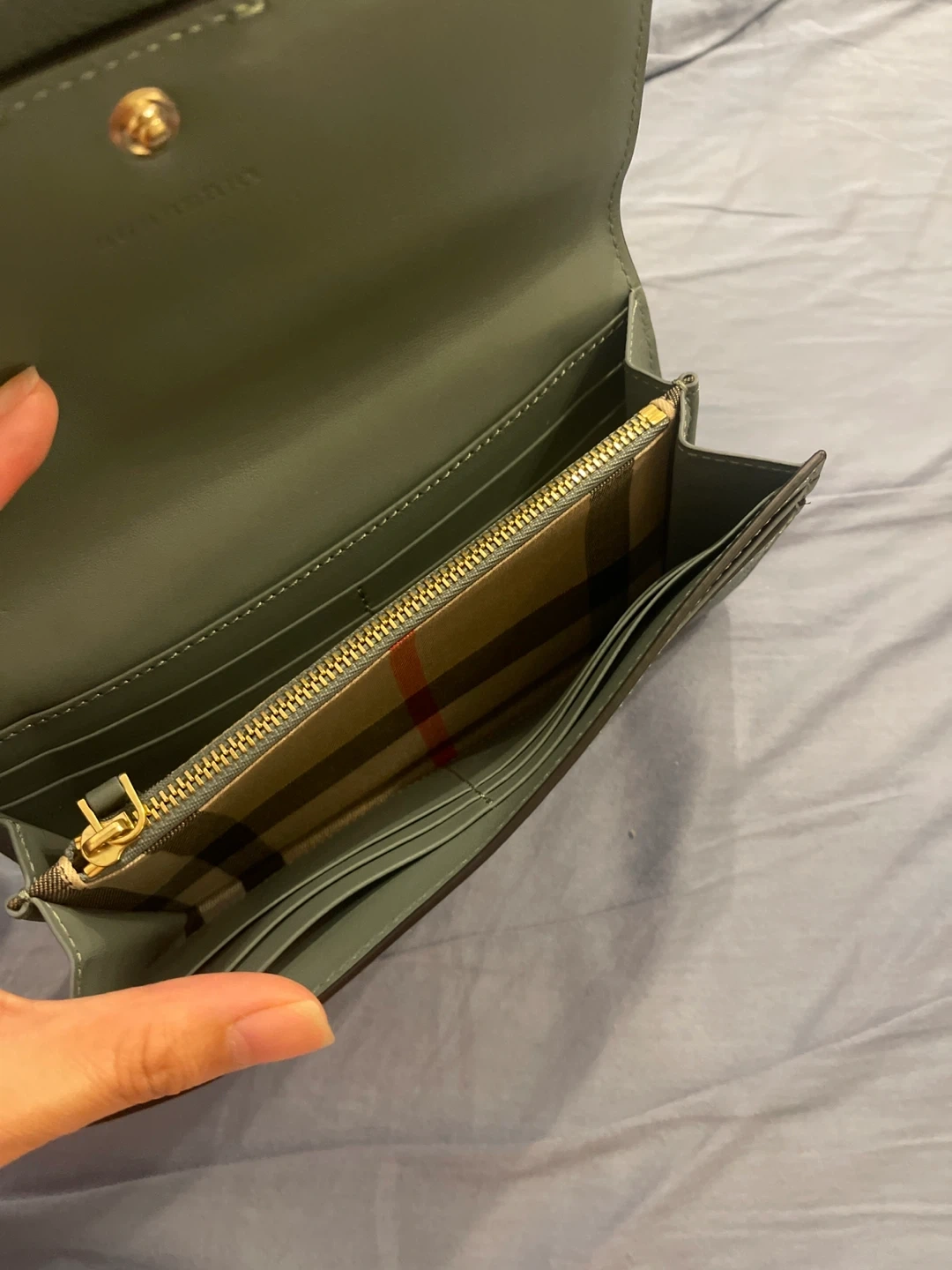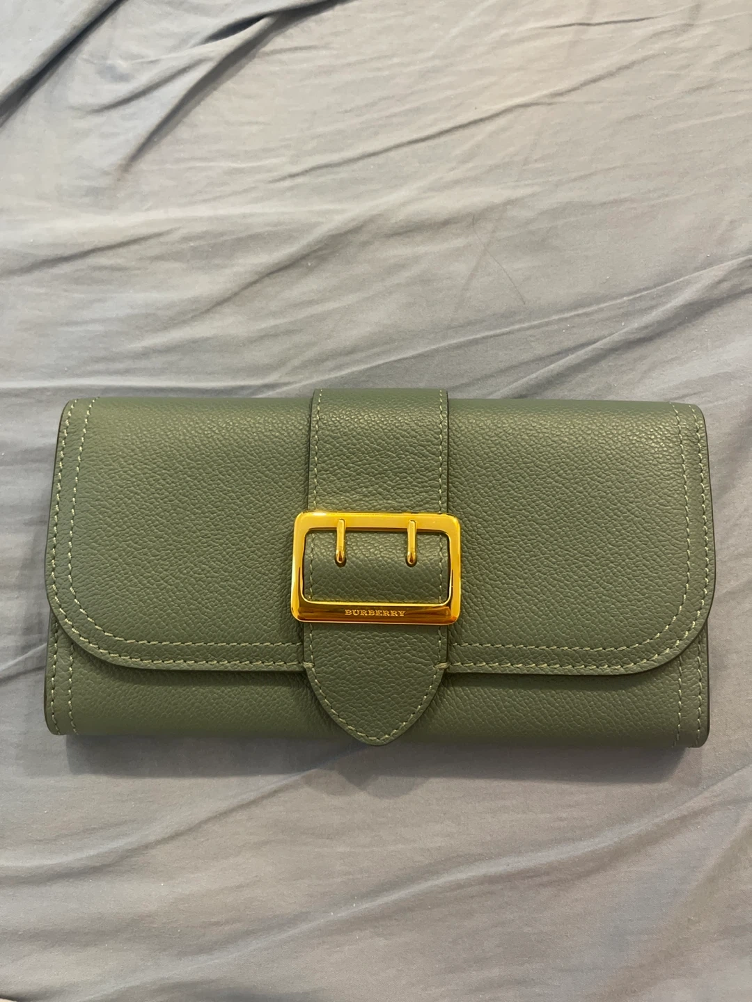 Selling a Burberry wallet in a beautiful green leather. It features a gold buckle detail and the classic Burberry plaid interior. Brand new ! It is in excellent condition!