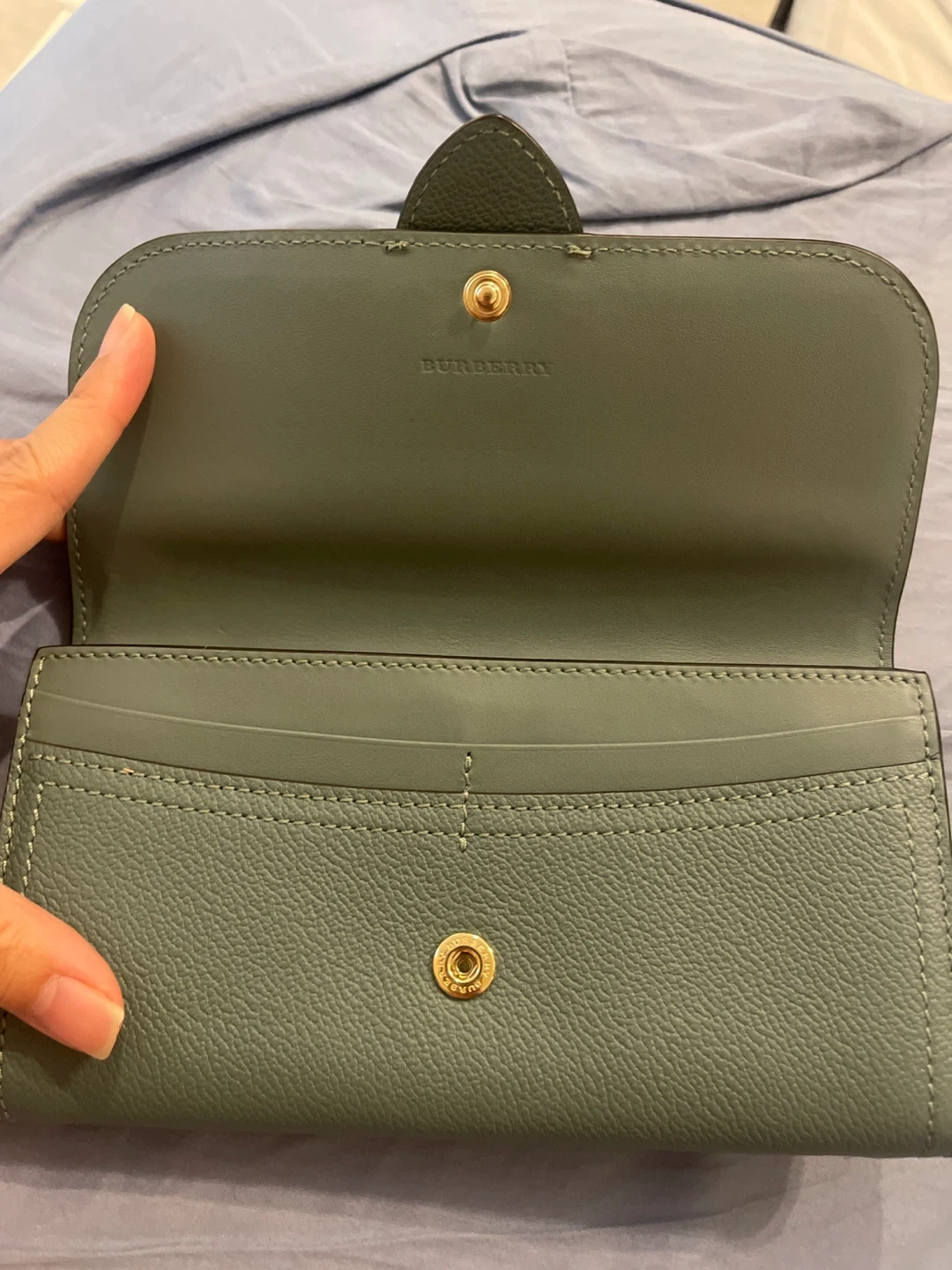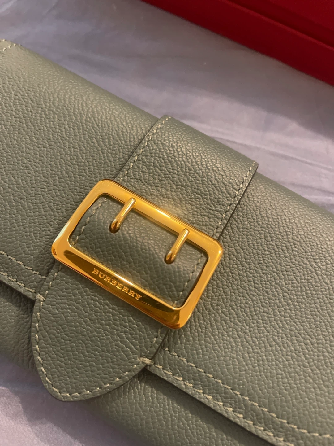 Selling a Burberry wallet in a beautiful green leather. It features a gold buckle detail and the classic Burberry plaid interior. Brand new ! It is in excellent condition!