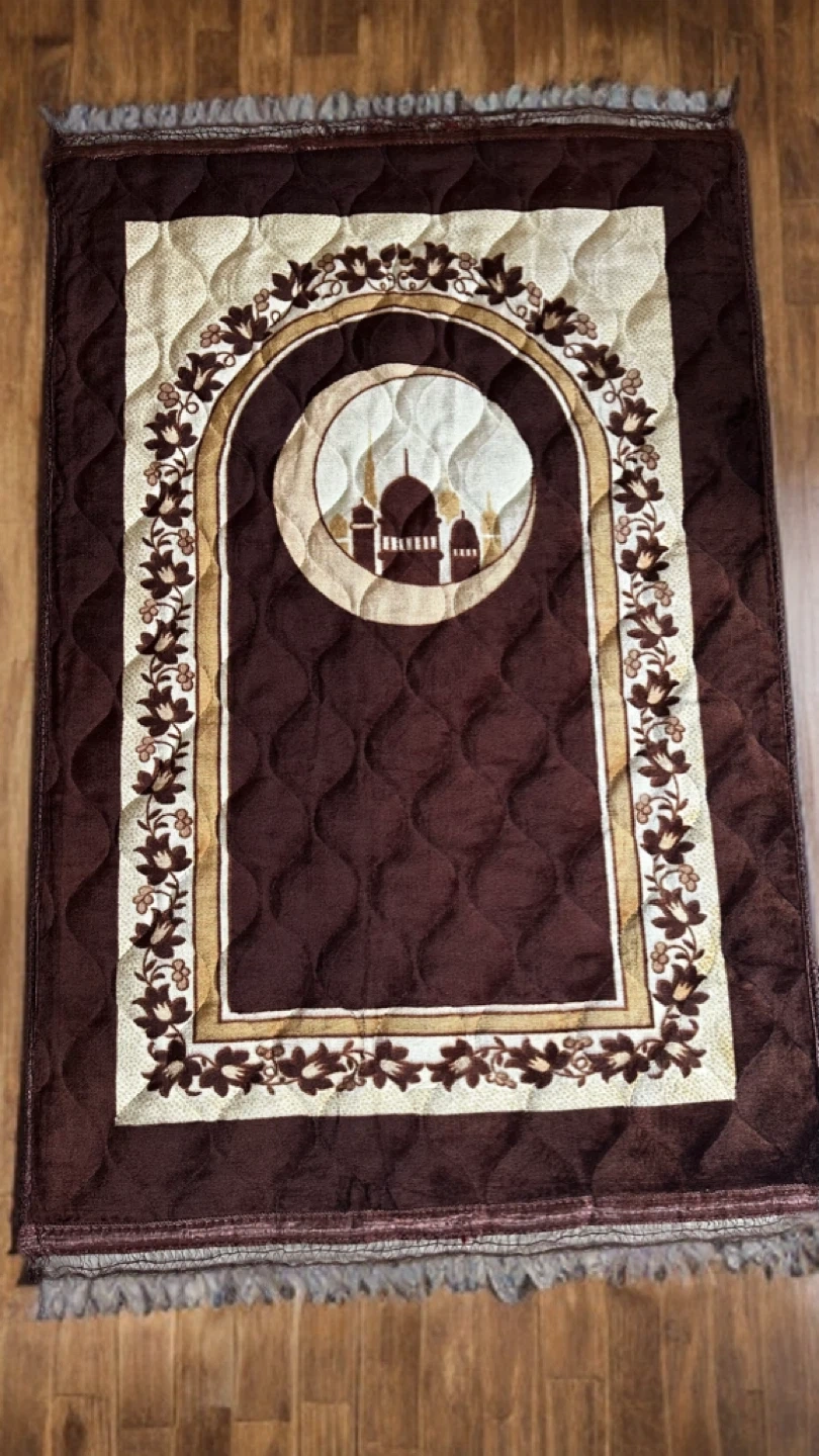 I'm selling a prayer rug, available in a variety of colours! It has a quilted texture and a decorative design featuring a mosque and crescent moon. Perfect for daily prayers or as a thoughtful gift