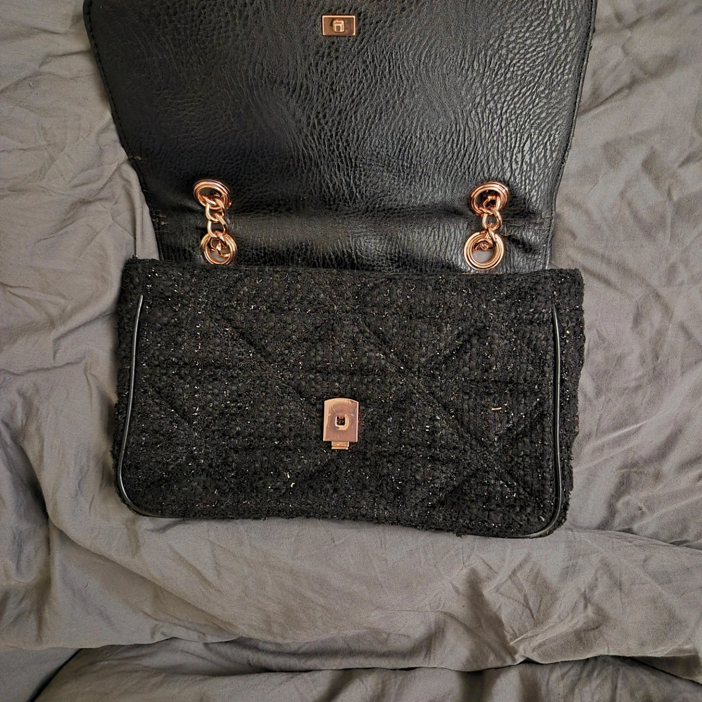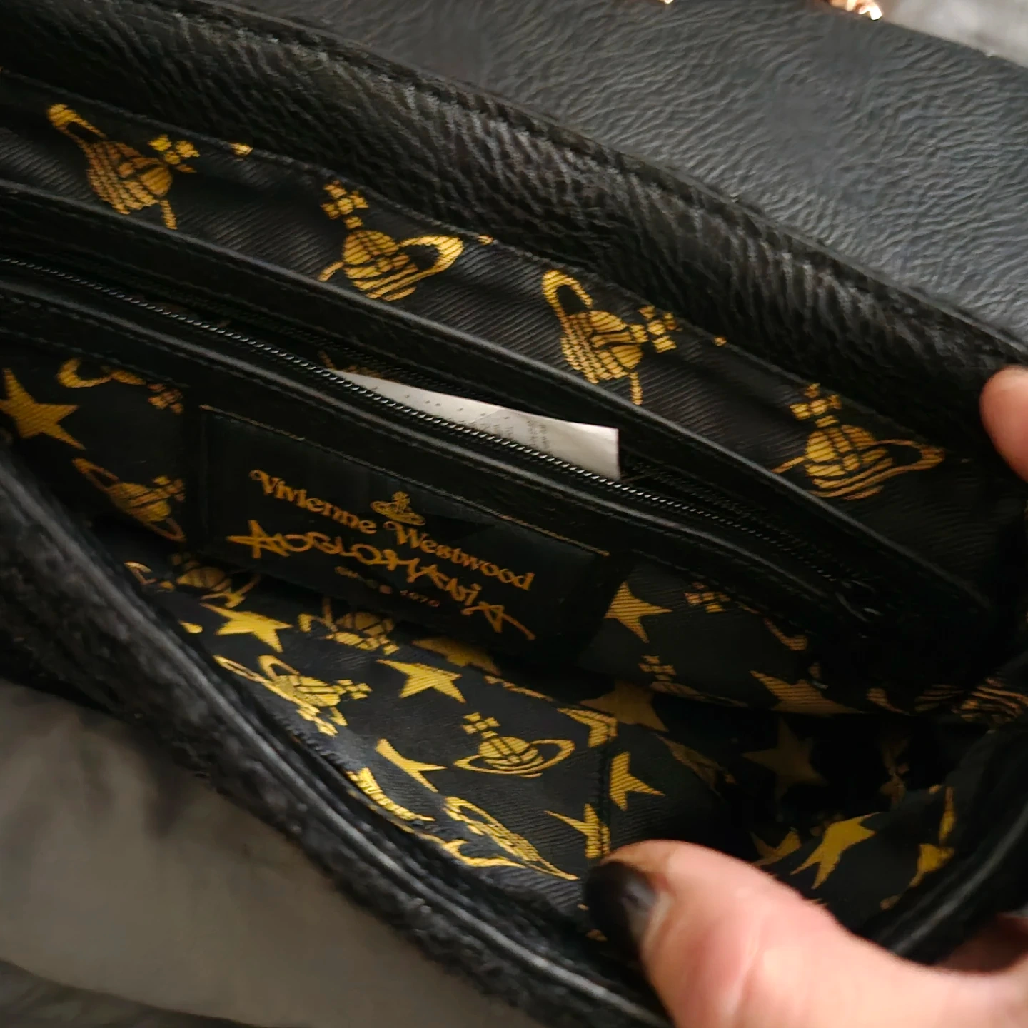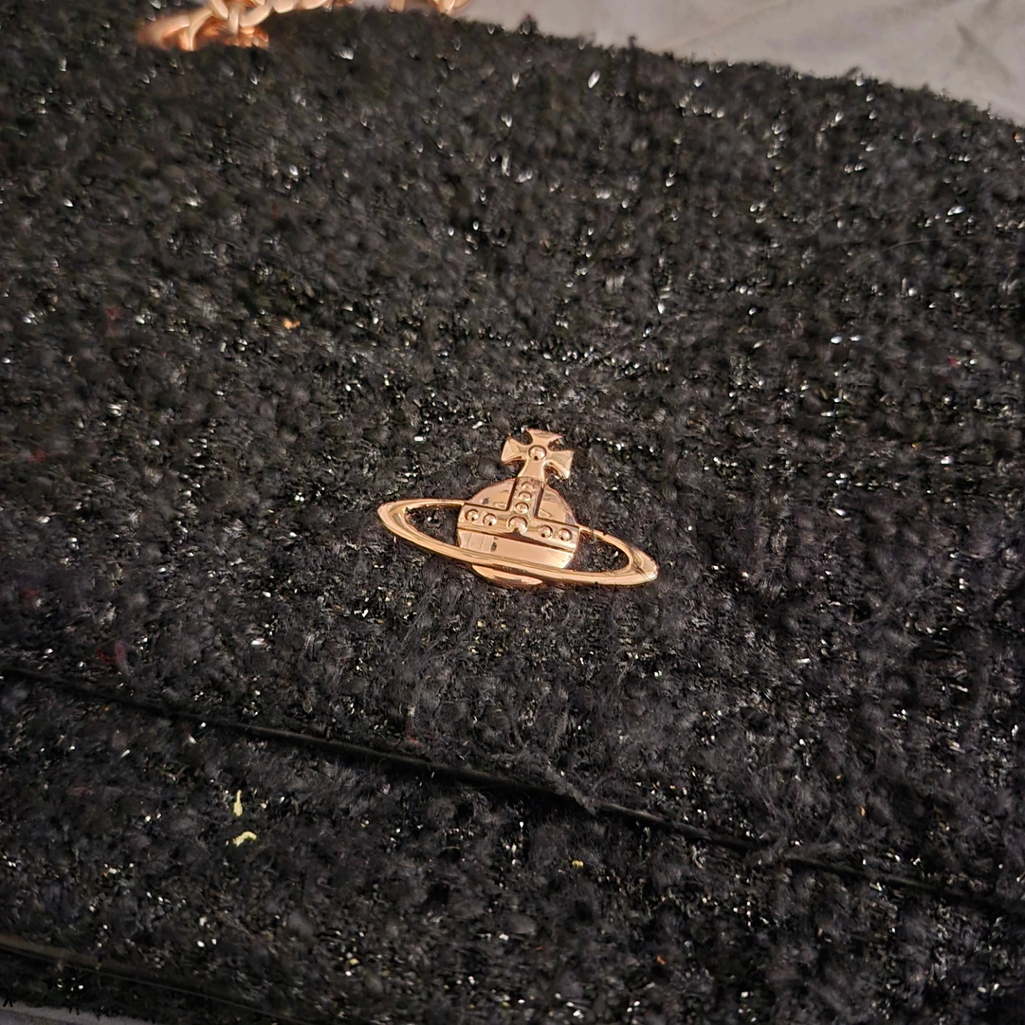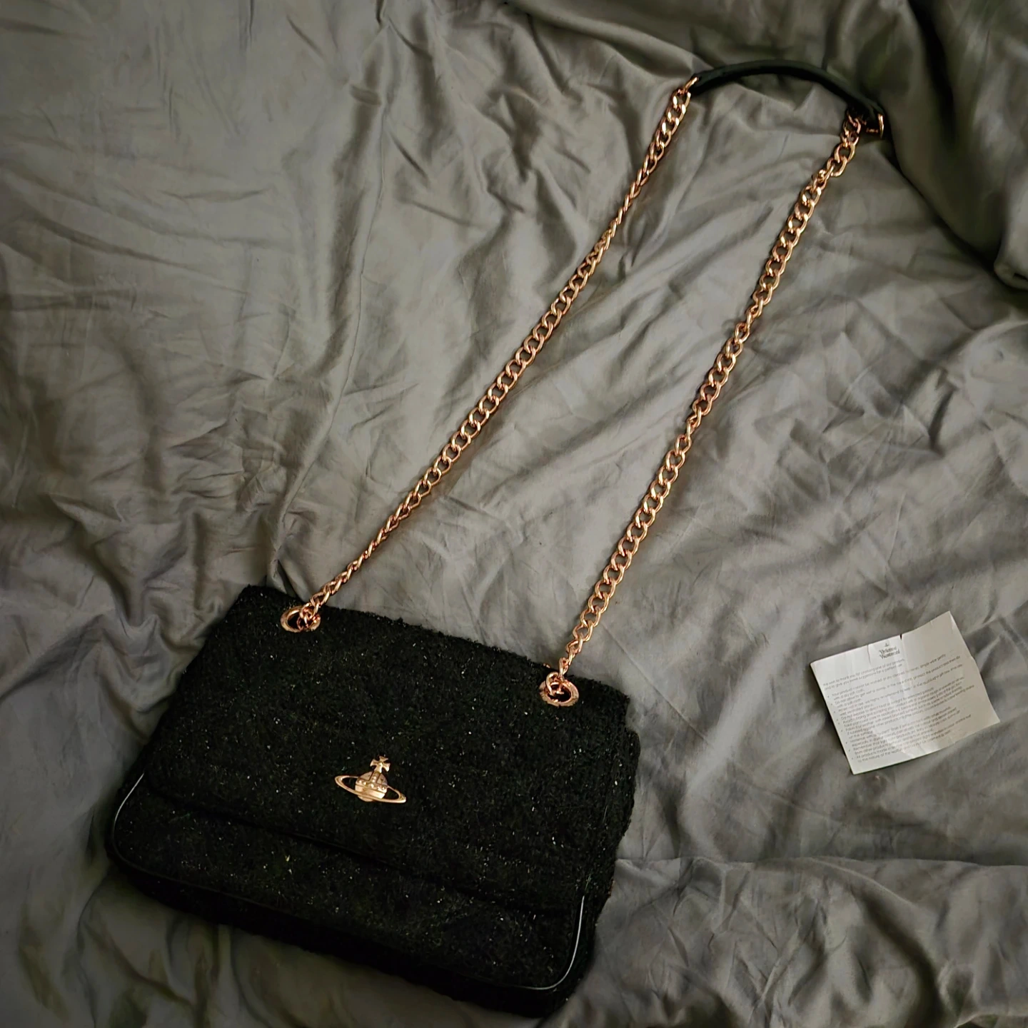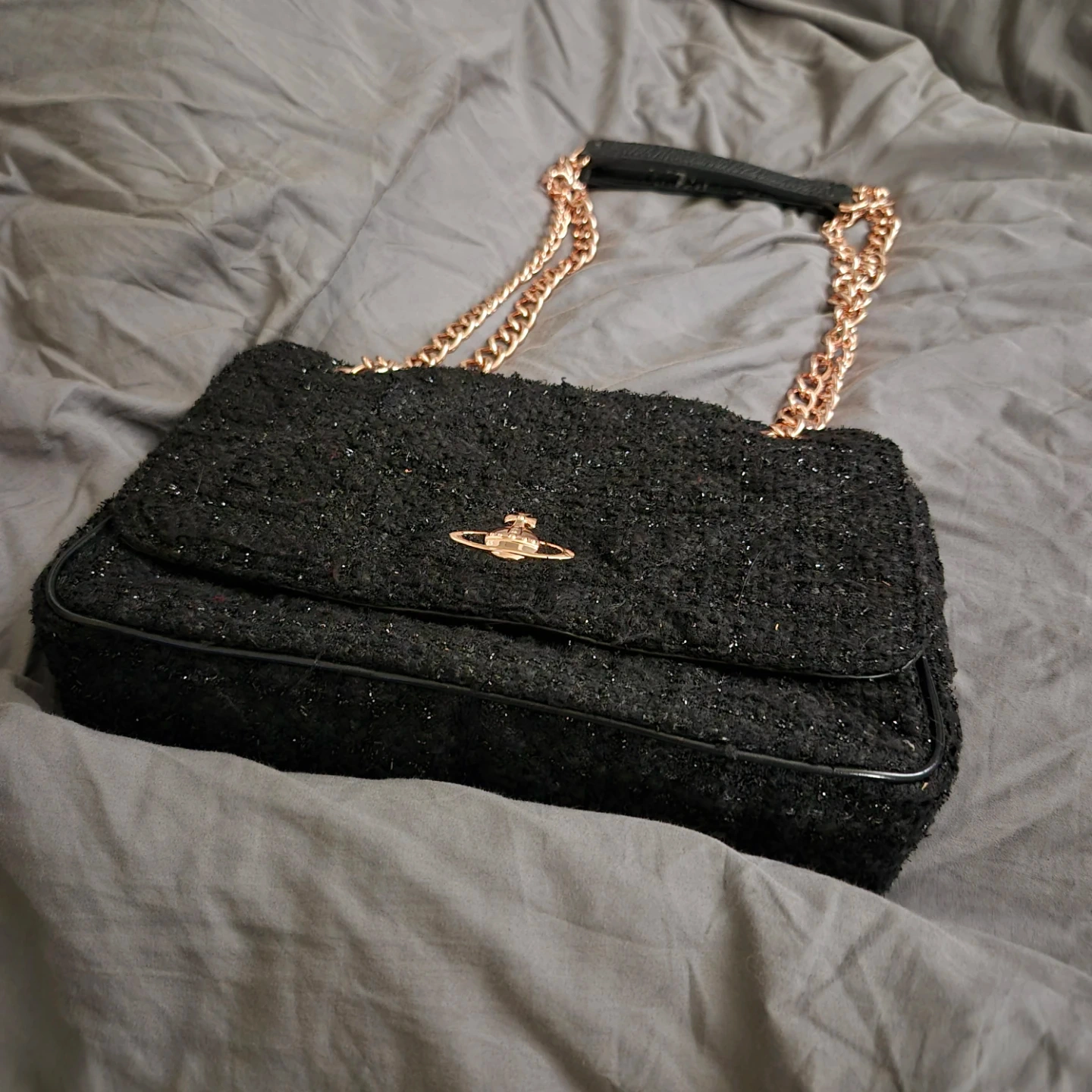 Selling a stylish Vivienne Westwood shoulder bag! It's a black tweed material with rose gold chain straps. The interior lining features the classic Vivienne Westwood orb and stars pattern.