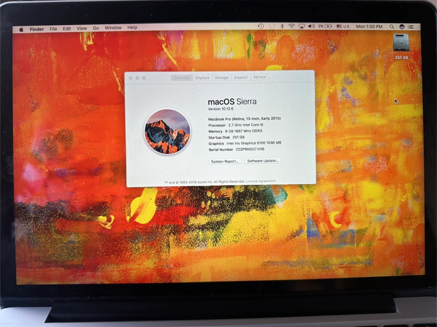 Selling a MacBook Pro 13-inch, Early 2015 model. It runs macOS Sierra. The processor is a 2.7 GHz Intel Core i5, with 8 GB of memory and a 251 GB SSD. Graphics are Intel Iris Graphics 6100 1536 MB.