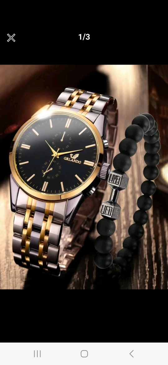 Selling a men's Orlando quartz watch. It comes with a bracelet. The watch has a gold and silver band with a black face. It's in great condition!