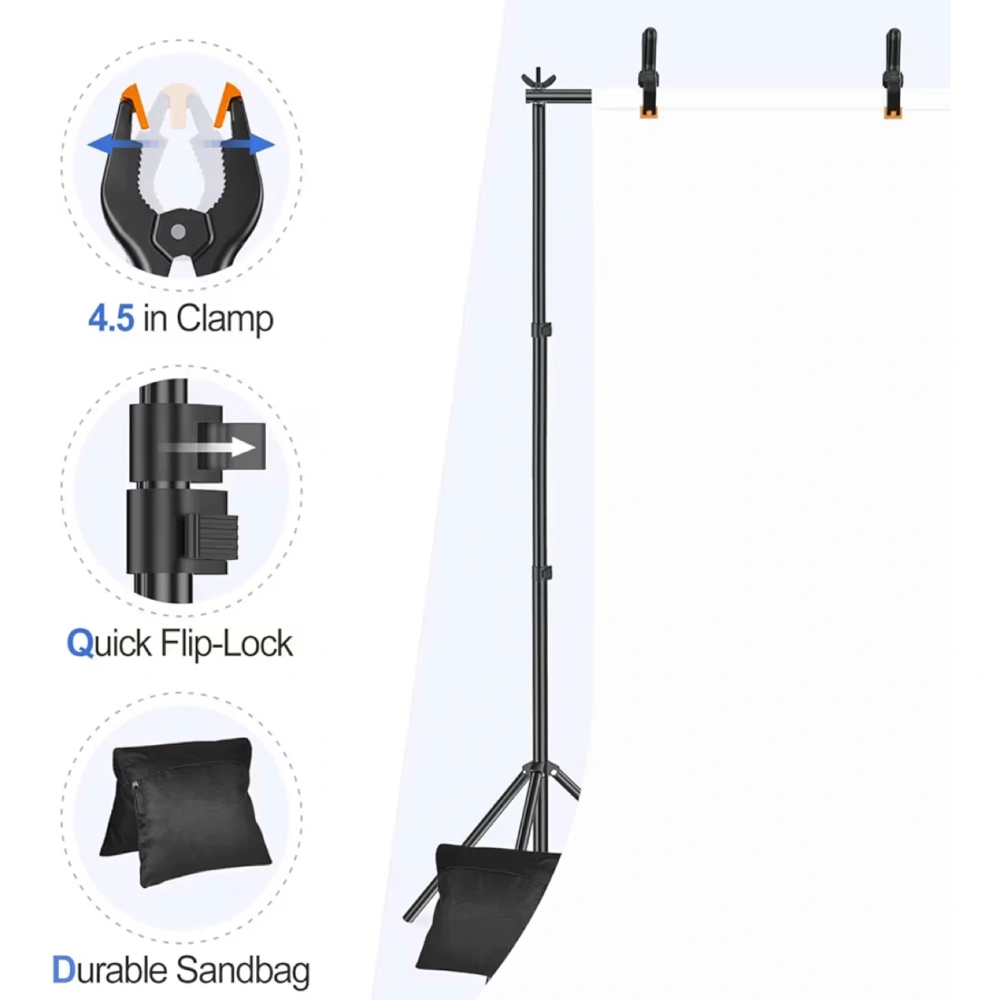 • 2 tripod backdrop stands, A retractable crossbar, 8 clamps, 2 durable sandbags and a carry bag
