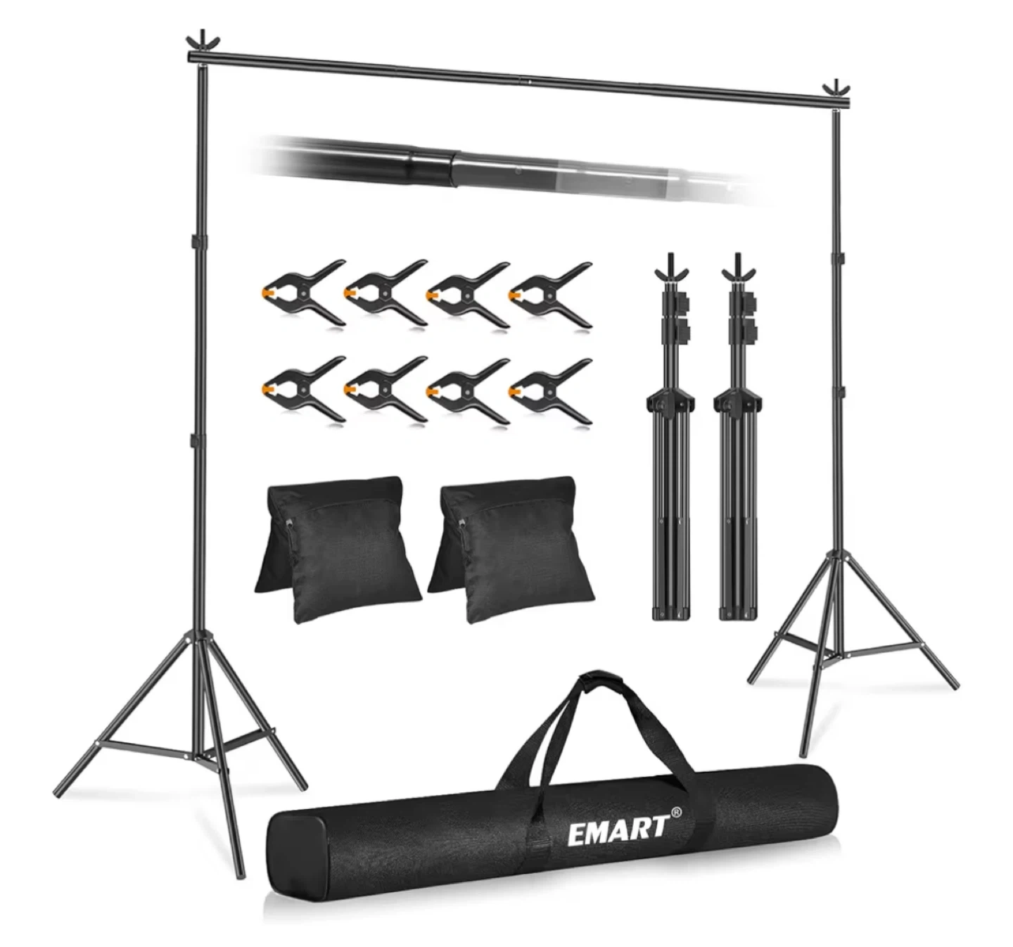 • 2 tripod backdrop stands, A retractable crossbar, 8 clamps, 2 durable sandbags and a carry bag