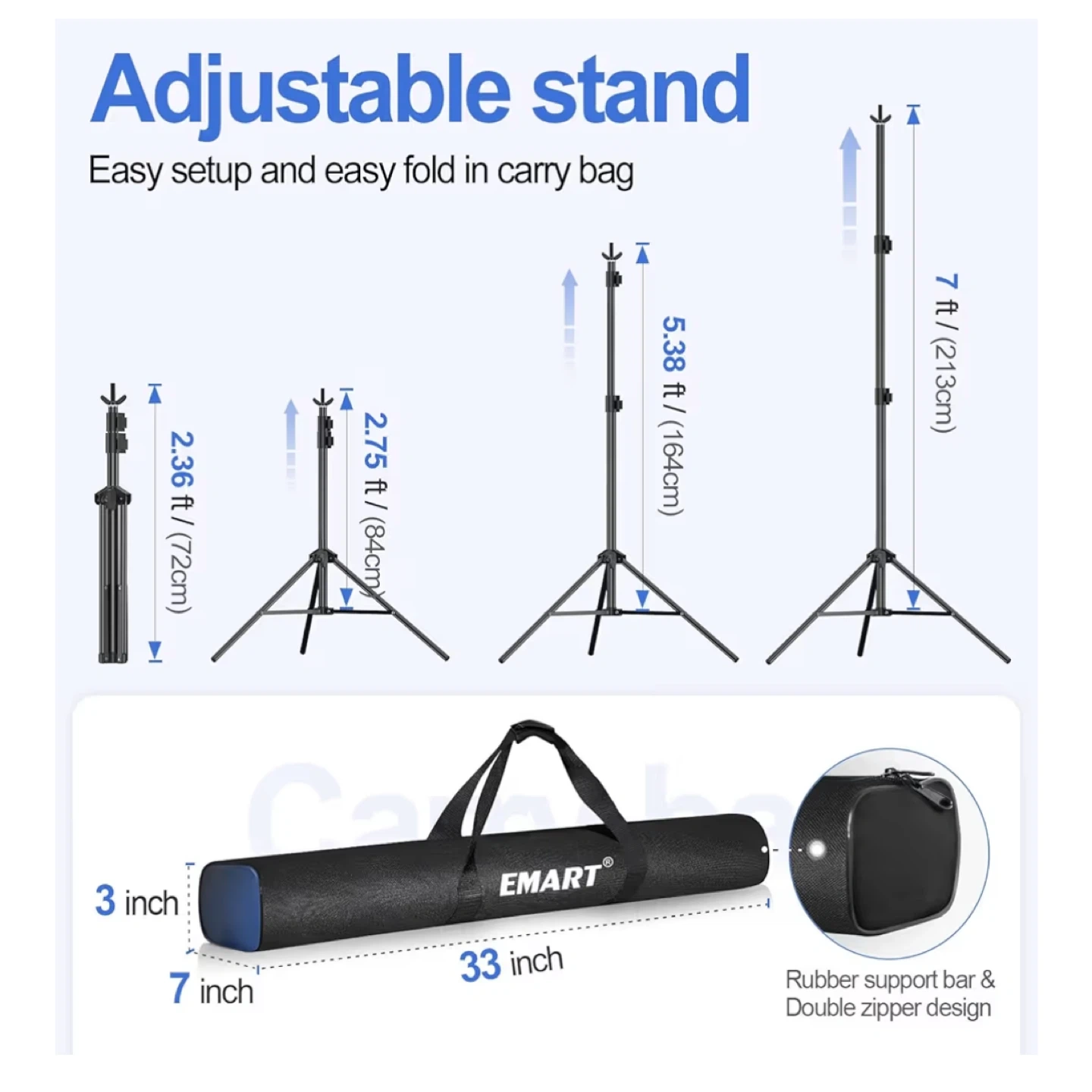 • Two sturdy tripod backdrop stands made of aluminium alloy (adjustable in height from 2.6 feet to 7.0 feet)