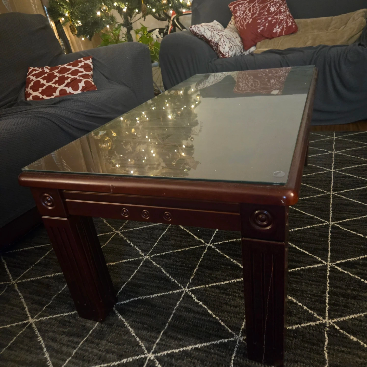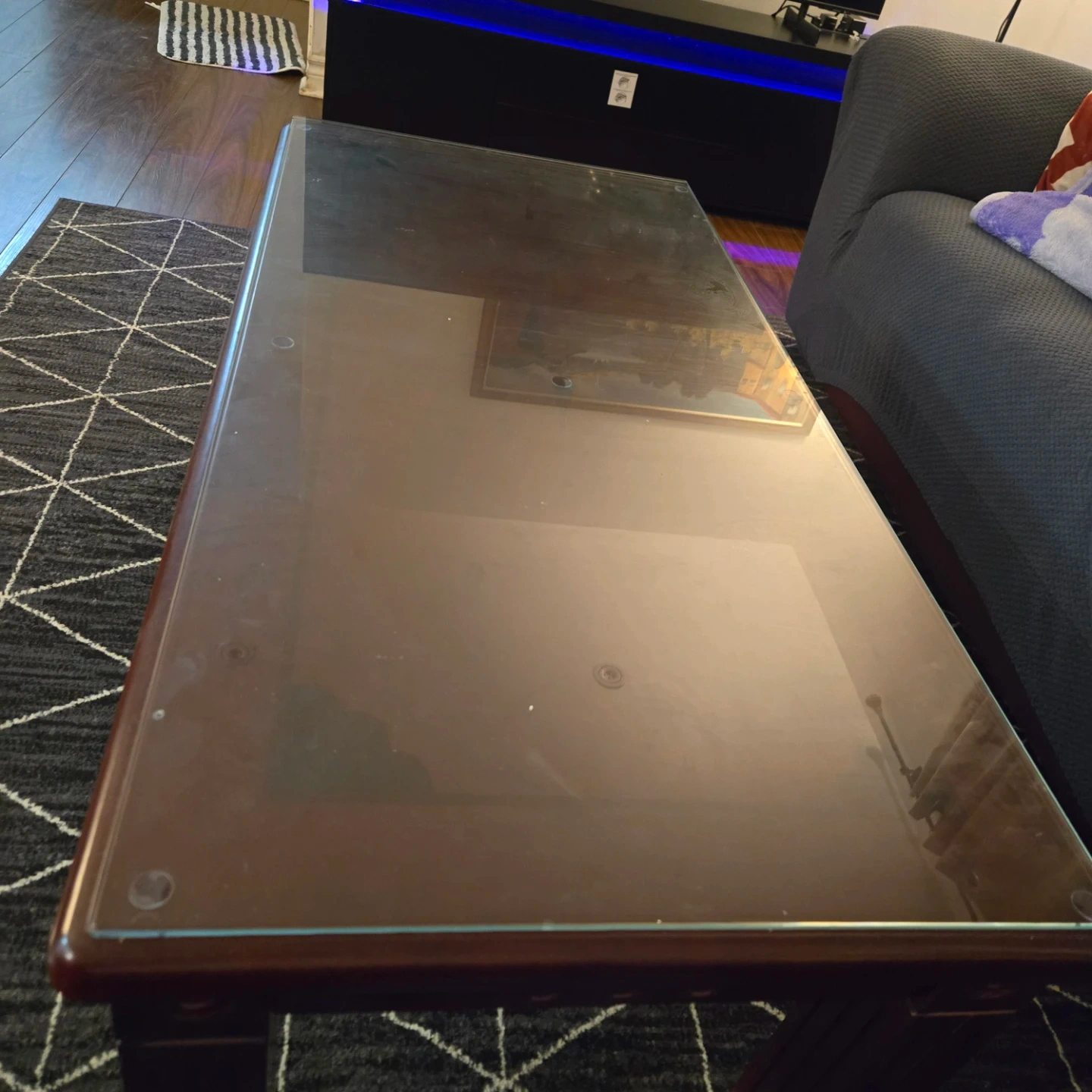 Selling a glass top centre table with a dark wood frame. It's in good condition and would be a great addition to any living room!